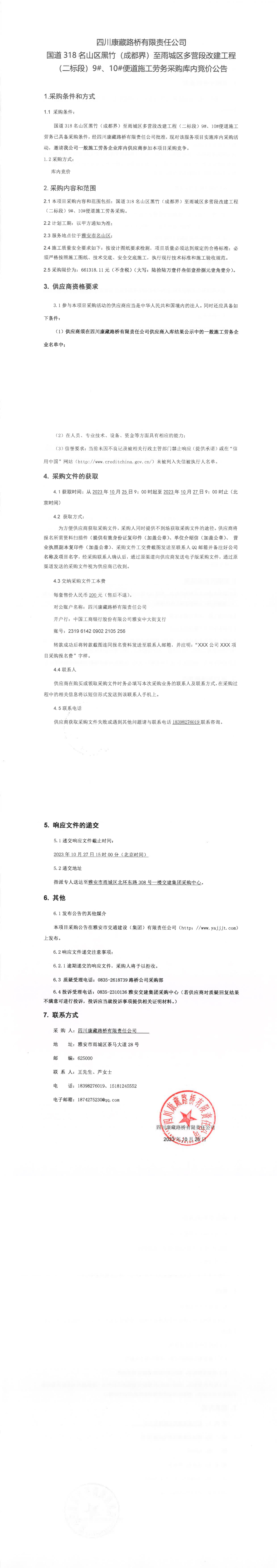 四川康藏路橋有限責(zé)任公司國道318名山區(qū)黑竹(成都界)至雨城區(qū)多營段改建工程(二標(biāo)段)9#、10#便道施工勞務(wù)采購庫內(nèi)競價公告