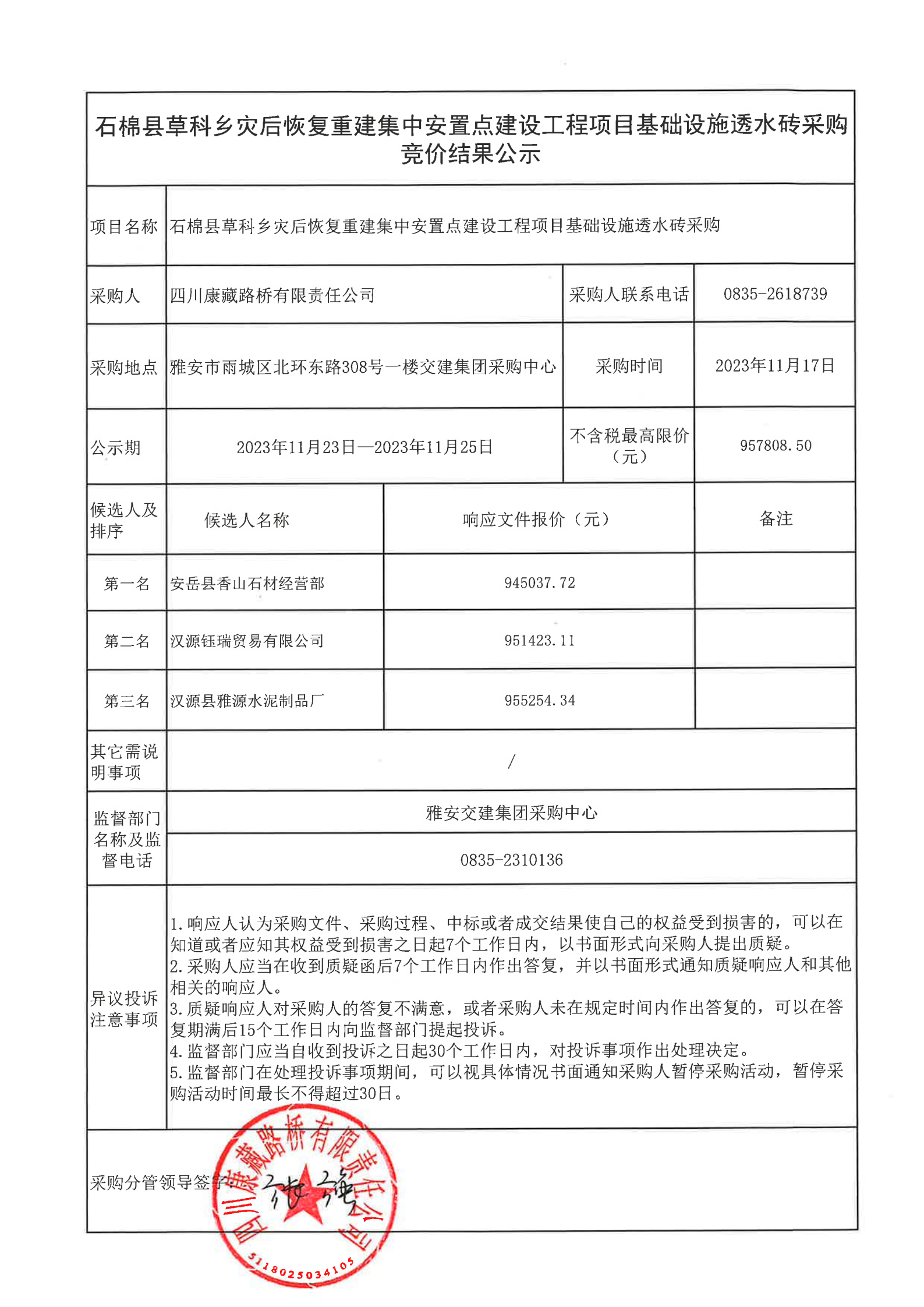 四川康藏路橋有限責任公司石棉縣草科鄉(xiāng)集中安置點重建工程項目透水磚采購結果公示