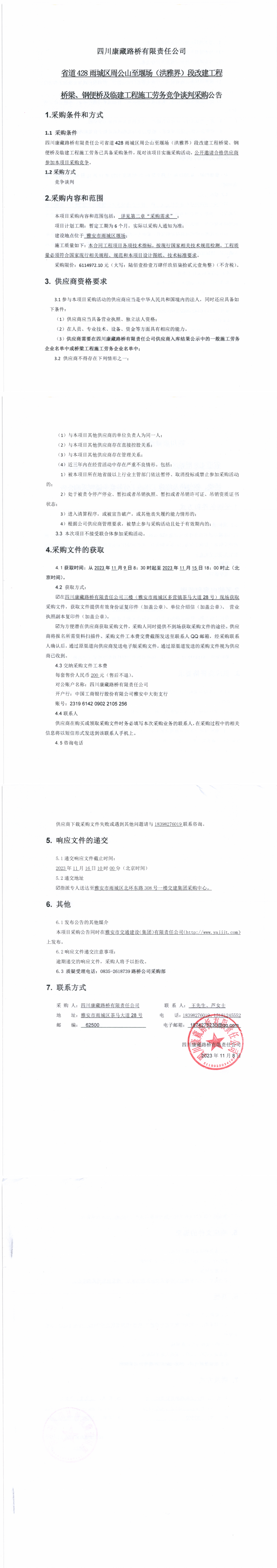四川康藏路橋有限責(zé)任公司省道428雨城區(qū)周公山至堰場(chǎng)(洪雅界)段改建工程橋梁、鋼便橋及臨建工程施工勞務(wù)采購(gòu)公告