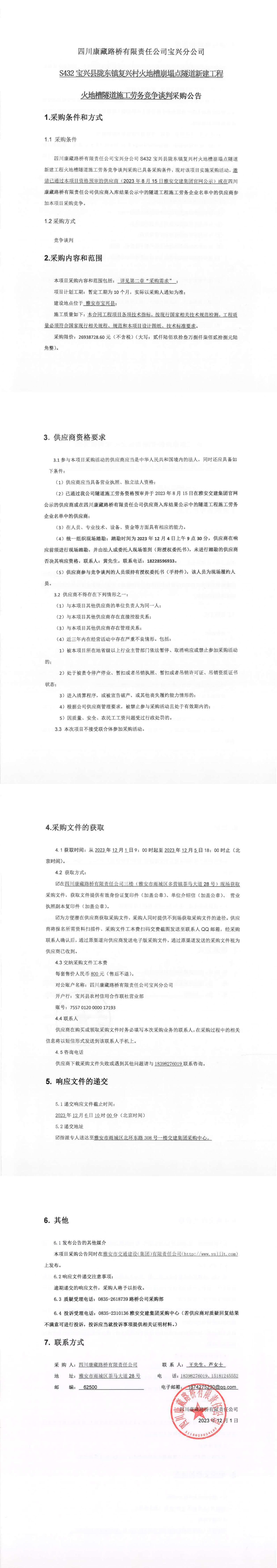 四川康藏路橋有限責(zé)任公司寶興分公司S432寶興縣隴東鎮(zhèn)復(fù)興村火地槽崩塌點(diǎn)隧道新建工程火地槽隧道施工勞務(wù)競爭談判采購公告