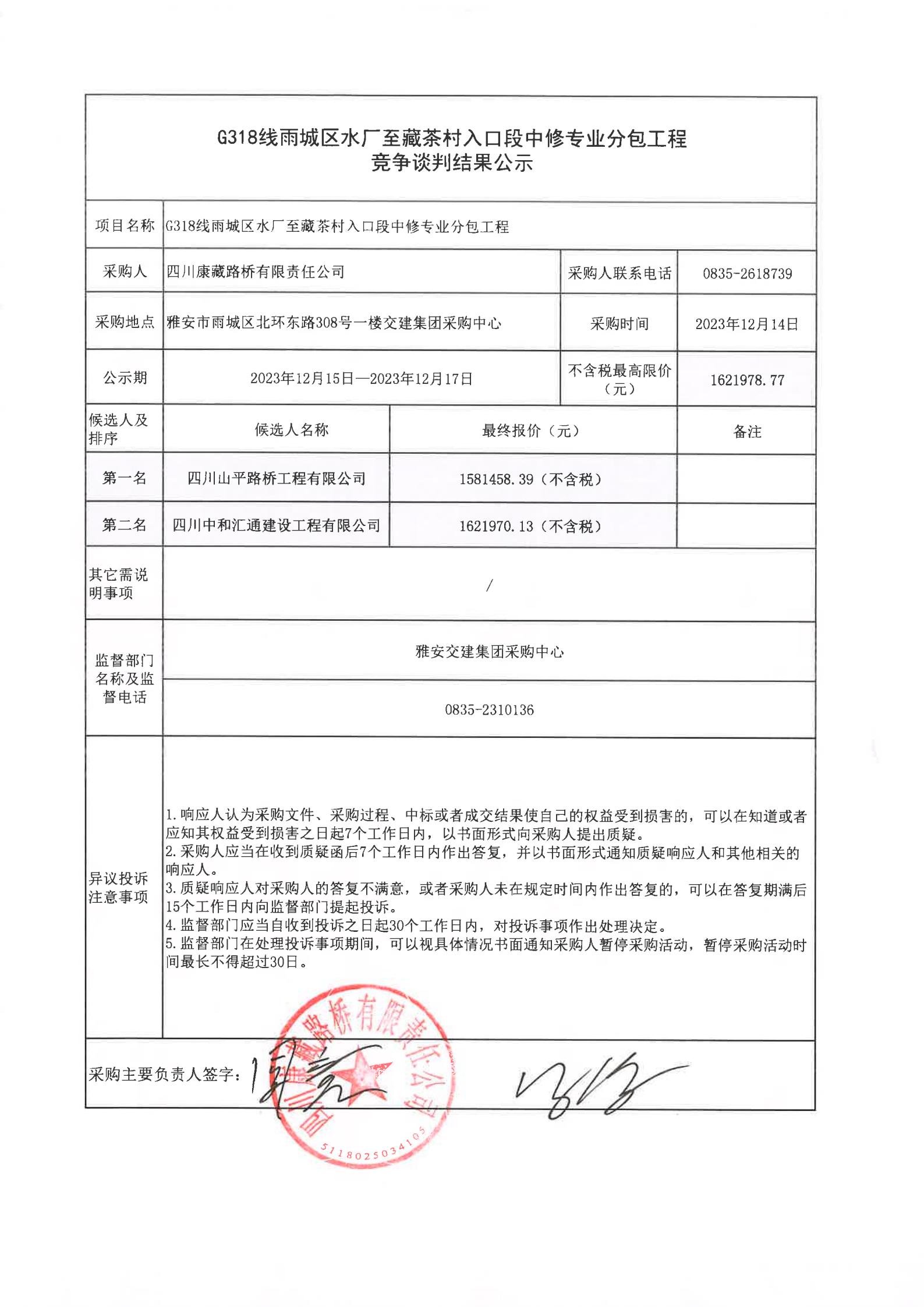 四川康藏路橋有限責(zé)任公司G318線雨城區(qū)水廠至藏茶村入口段中修專業(yè)分包工程競爭談判結(jié)果公示