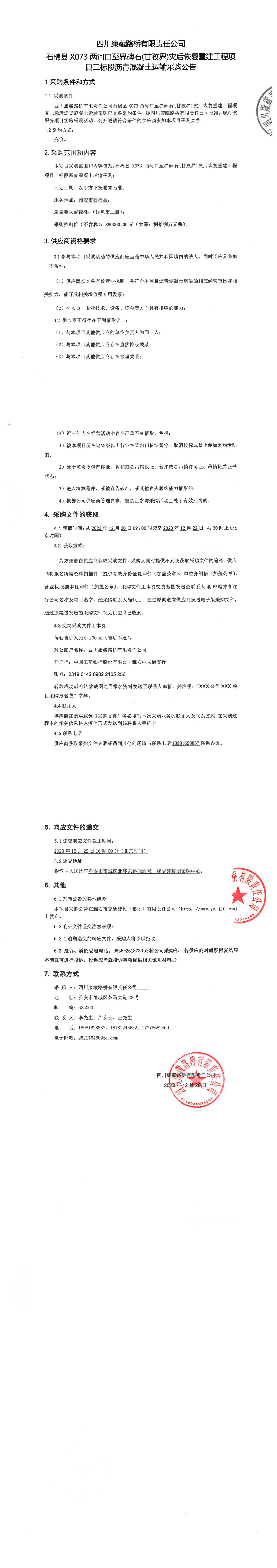 四川康藏路橋有限責(zé)任公司石棉縣X073兩河口至界碑石(甘孜界)災(zāi)后恢復(fù)重建工程項(xiàng)目二標(biāo)段瀝青混凝土運(yùn)輸采購公告