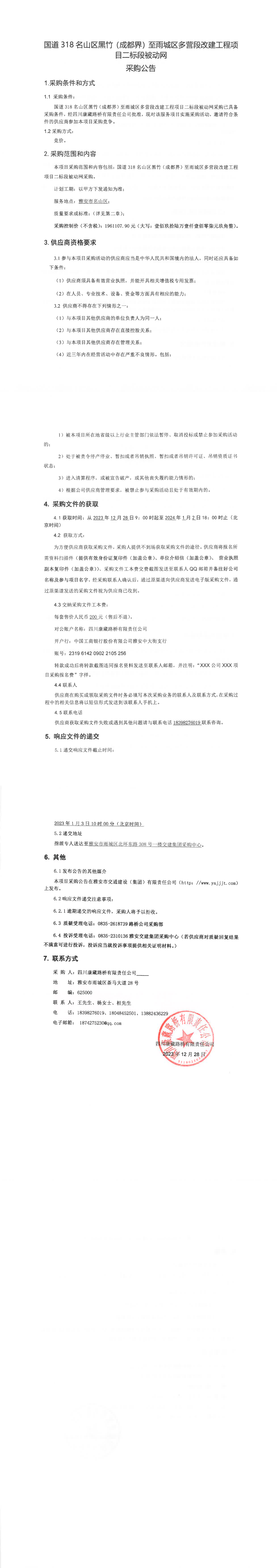 四川康藏路橋有限責(zé)任公司國道318名山區(qū)黑竹(成都界)至雨城區(qū)多營段改建工程項(xiàng)目二標(biāo)段被動網(wǎng)采購公告