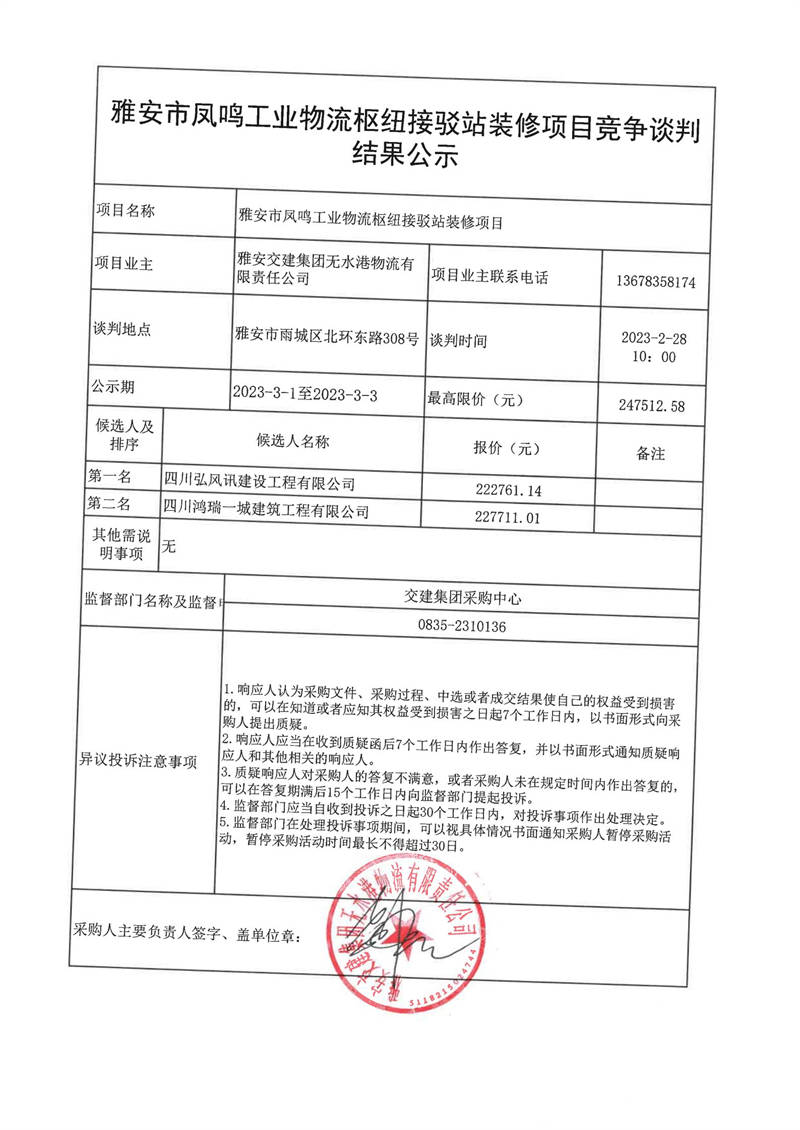 雅安交建集團無水港物流有限責任公司雅安市鳳鳴工業(yè)物流樞紐接駁站裝修項目競爭談判結(jié)果公示