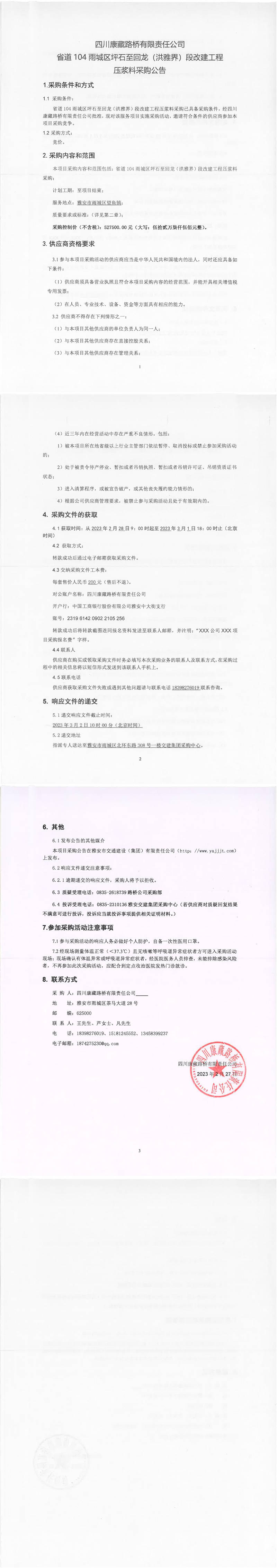 四川康藏路橋有限責(zé)任公司省道104雨城區(qū)坪石至回龍(洪雅界)段改建工程壓漿料采購公告