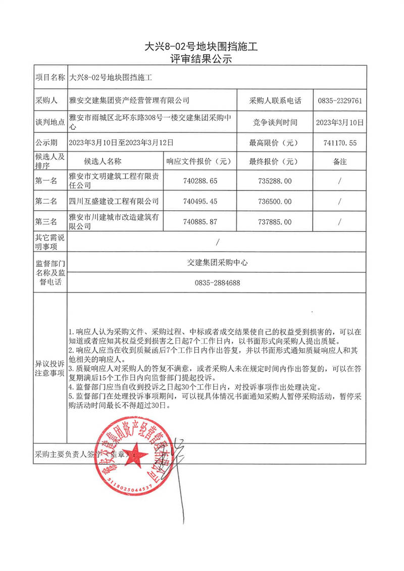 雅安交建集團(tuán)資產(chǎn)經(jīng)營管理有限公司大興8-02號地塊圍擋施工結(jié)果公示