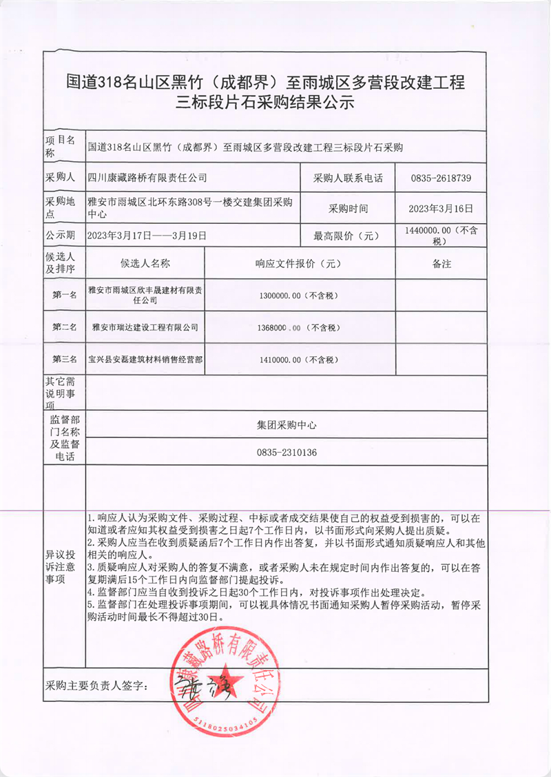 四川康藏路橋有限責(zé)任公司國道318名山區(qū)黑竹(成都界)至雨城區(qū)多營段改建工程三標(biāo)段片石采購結(jié)果公示
