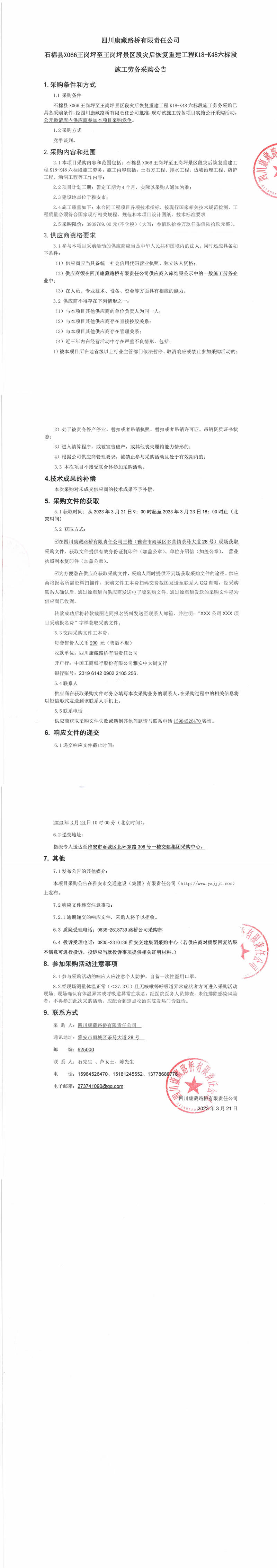 四川康藏路橋有限責(zé)任公司石棉縣X066王崗坪至王崗坪景區(qū)段災(zāi)后恢復(fù)重建工程K18-K48六標(biāo)段施工勞務(wù)采購(gòu)公告