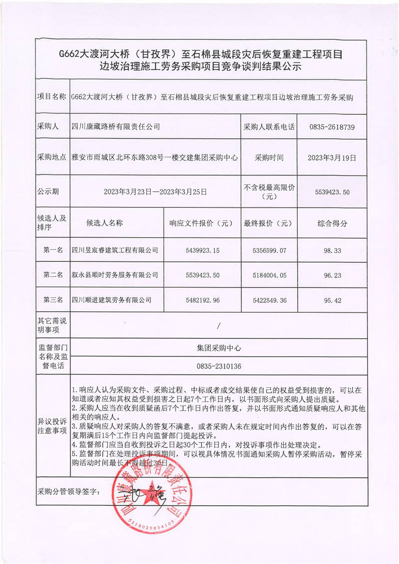 四川康藏路橋有限責(zé)任公司G662大渡河大橋(甘孜界)至石棉縣城段災(zāi)后恢復(fù)重建工程項目邊坡治理施工勞務(wù)采購項目競爭談判結(jié)果公示