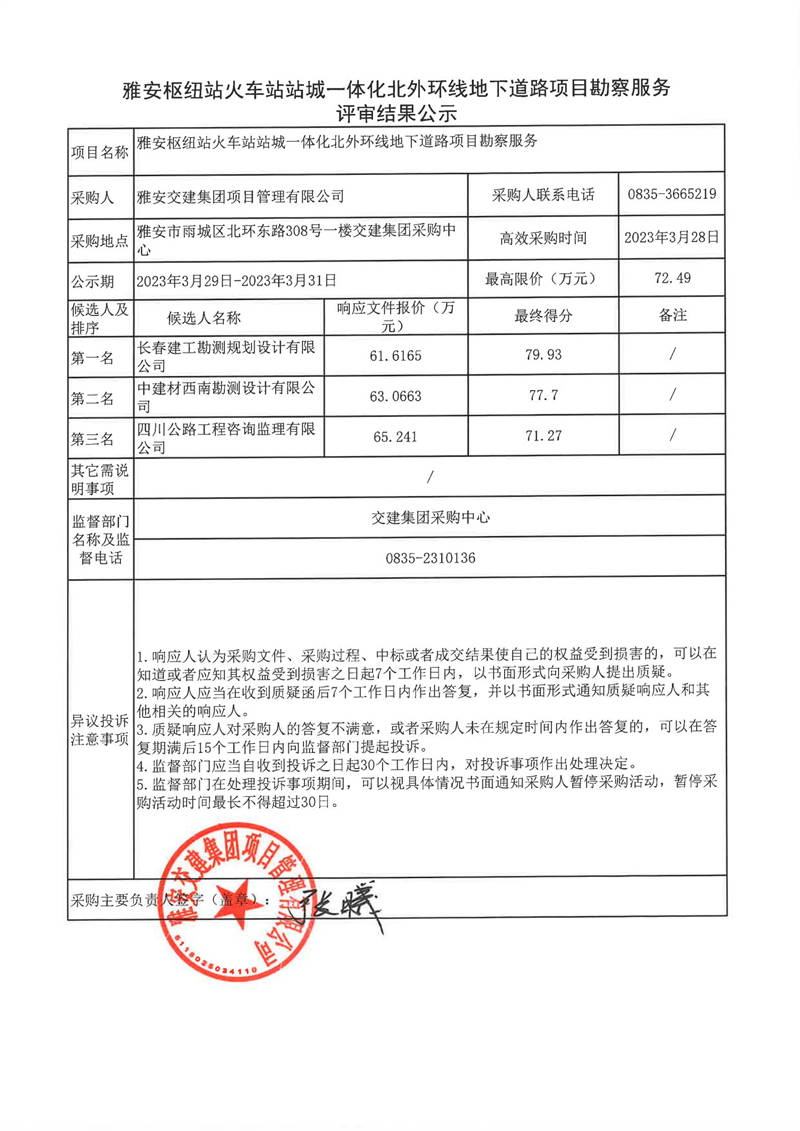 雅安交建集團(tuán)項(xiàng)目管理有限公司雅安樞紐站火車站站城一體化北外環(huán)線地下道路項(xiàng)目勘察服務(wù)評(píng)審結(jié)果公示