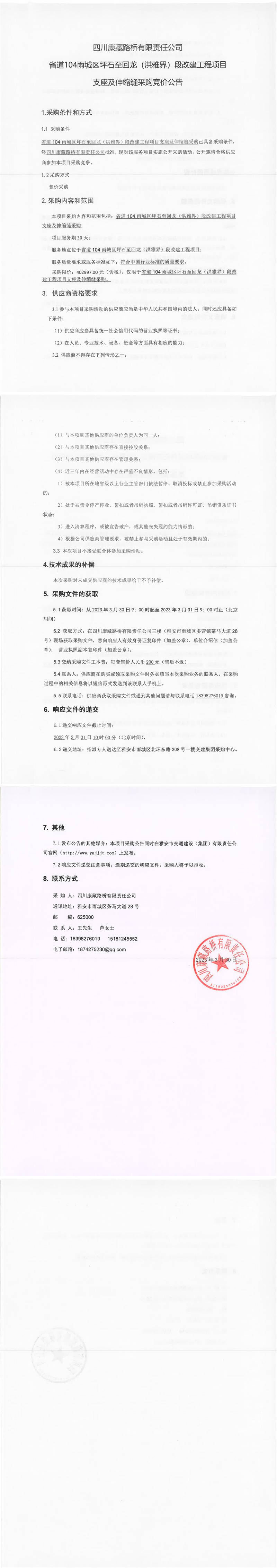 四川康藏路橋有限責(zé)任公司省道104雨城區(qū)坪石至回龍(洪雅界)段改建工程項(xiàng)目支座及伸縮縫采購(gòu)競(jìng)價(jià)公告