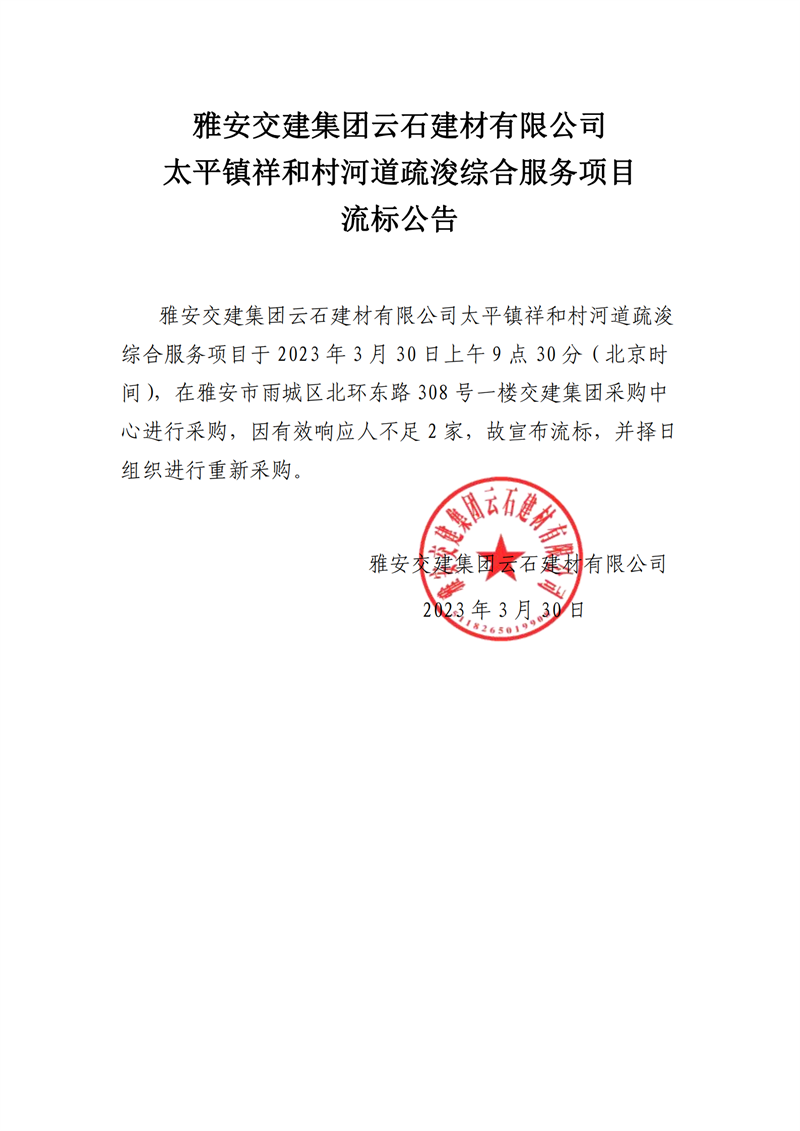 雅安交建集團云石建材有限公司太平鎮(zhèn)祥和村河道疏浚綜合服務(wù)項目流標通知