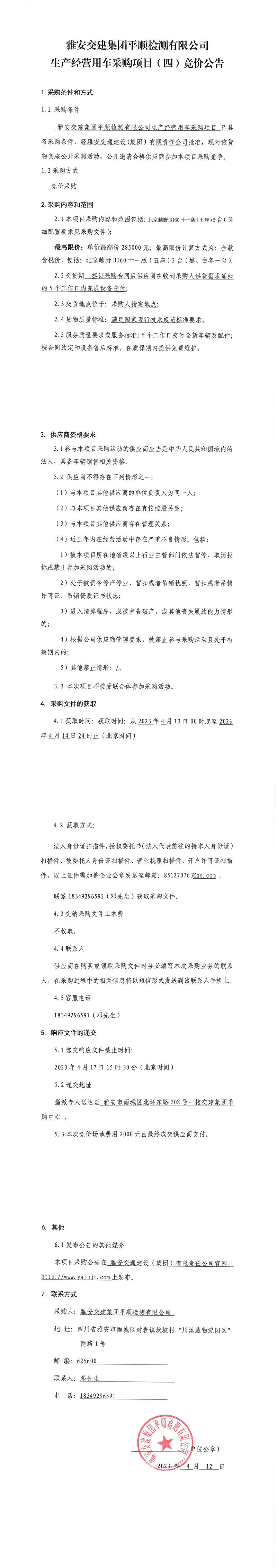 雅安交建集團(tuán)平順檢測有限公司平順公司生產(chǎn)經(jīng)營用車采購項(xiàng)目(四)競價公告