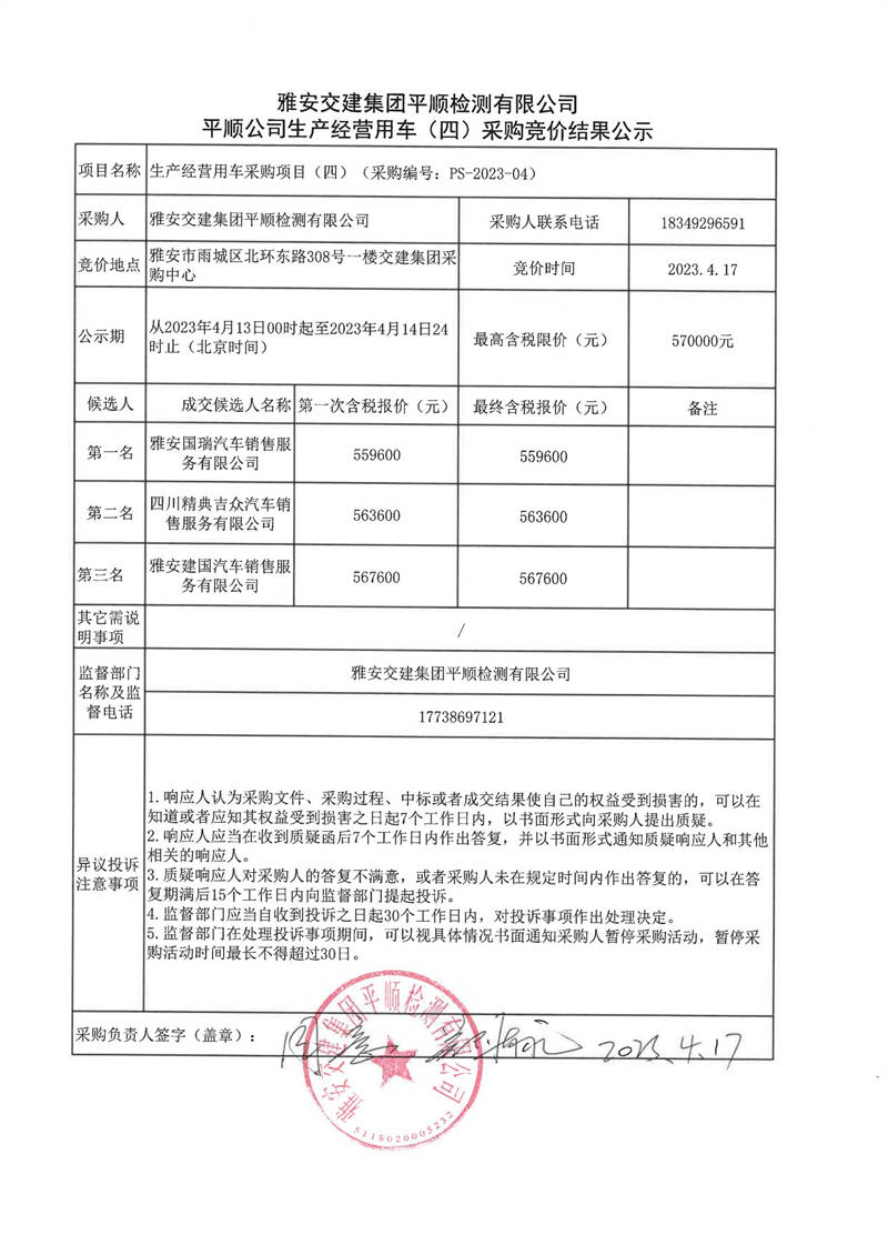 雅安交建集團平順檢測有限公司平順公司生產(chǎn)經(jīng)營用車(四)采購競價結果公示