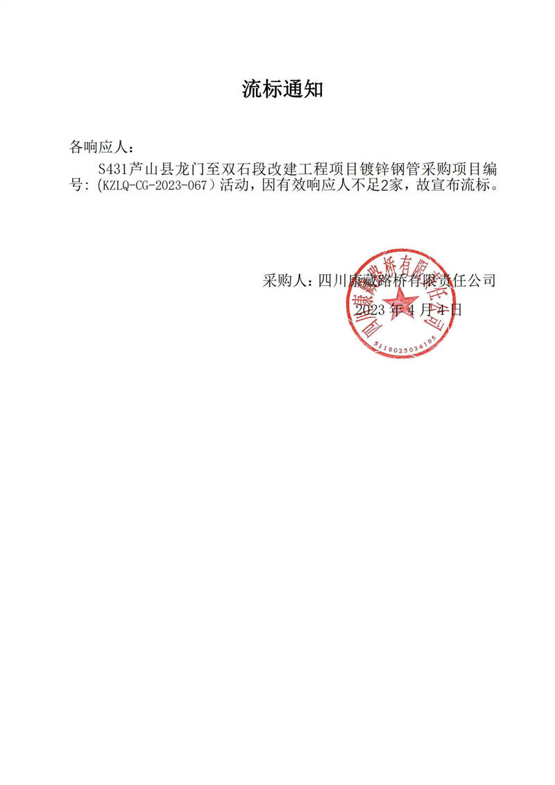 四川康藏路橋有限責任公司S431蘆山縣龍門至雙石段改建工程項目鍍鋅鋼管采購流標通知