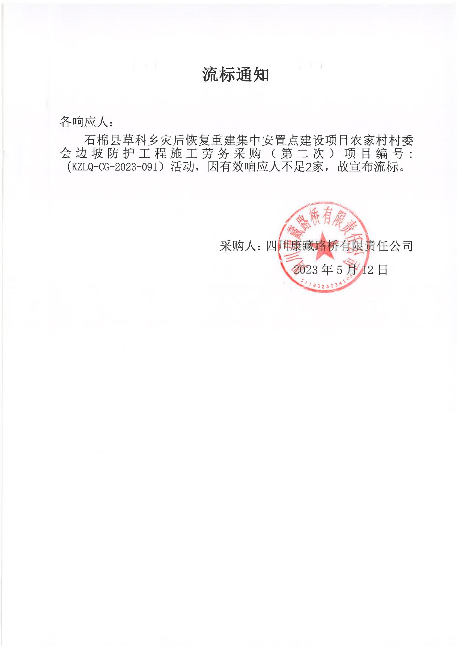 四川康藏路橋有限責(zé)任公司石棉草科鄉(xiāng)集中安置點建設(shè)項目農(nóng)家村村委會邊坡防護工程施工勞務(wù)采購(第二次)流標通知
