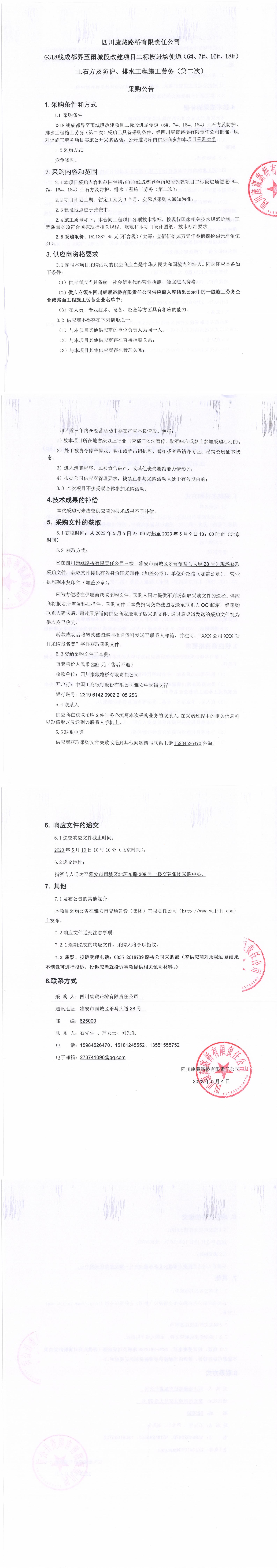 四川康藏路橋有限責(zé)任公司G318線成都至雨城段改建項目二標段進場便道(6#、7#、16#、18#)土石方及防護、排水工程施工勞務(wù)(第二次)采購公告