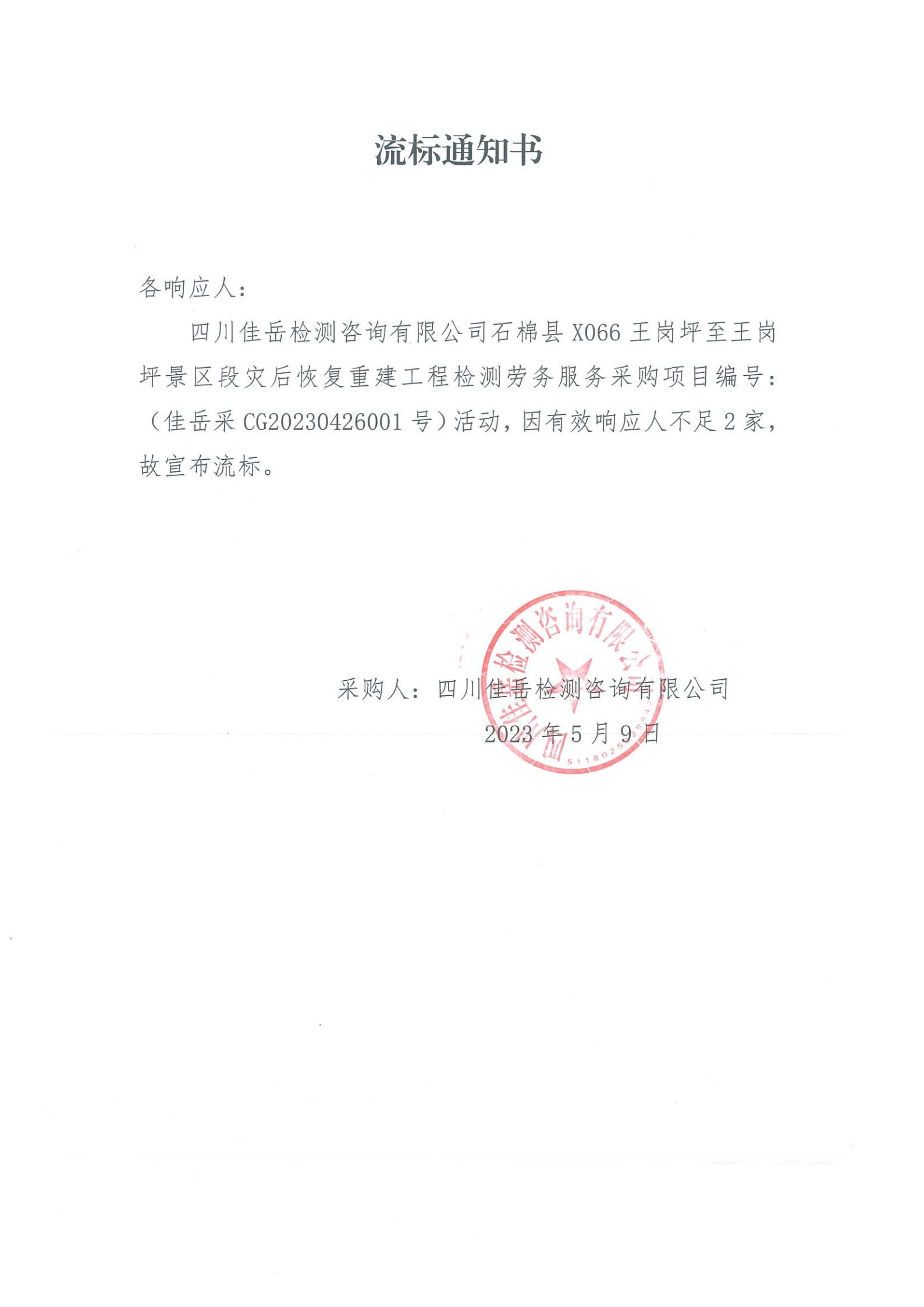 四川佳岳檢測(cè)咨詢有限公司石棉縣X066王崗坪至王崗坪景區(qū)段災(zāi)后恢復(fù)重建工程檢測(cè)勞務(wù)服務(wù)流標(biāo)通知