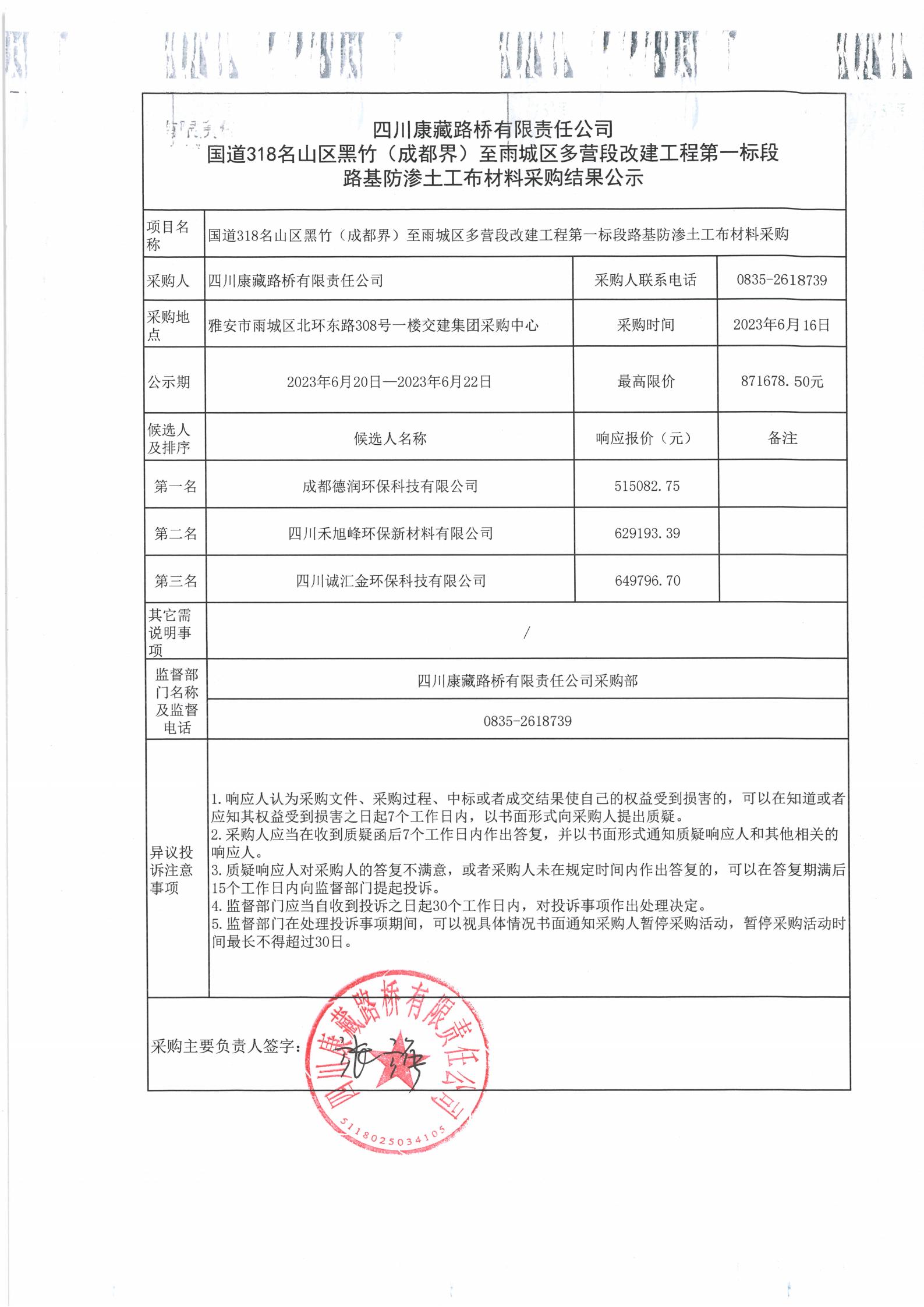 四川康藏路橋有限責(zé)任公司國道318名山區(qū)黑竹(成都界)至雨城區(qū)多營段改建工程第一標段路基防滲土工布材料采購結(jié)果公示