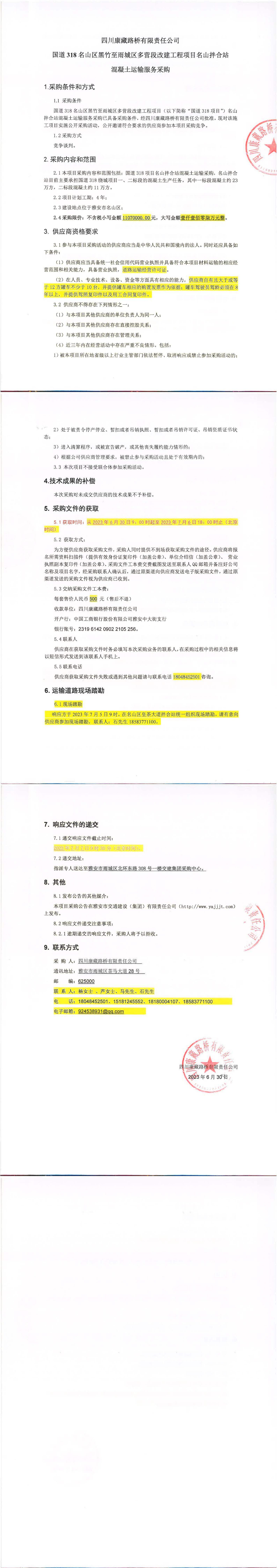 四川康藏路橋有限責任公司國道318名山區(qū)黑竹至雨城區(qū)多營段改建工程項目名山拌合站混凝土運輸服務采購