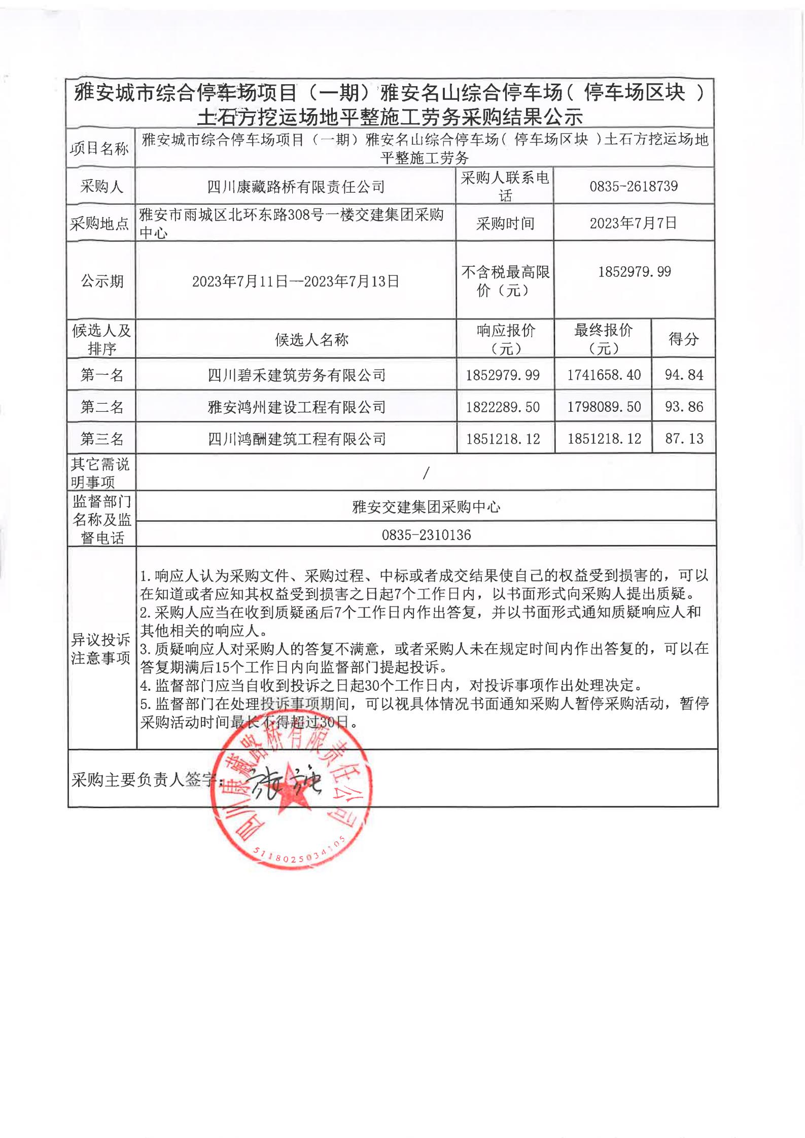 四川康藏路橋有限責(zé)任公司雅安城市綜合停車場(chǎng)項(xiàng)目(一期)雅安名山綜合停車場(chǎng)(停車場(chǎng)區(qū)塊)土石方挖運(yùn)場(chǎng)地平整施工勞務(wù)采購(gòu)結(jié)果公示