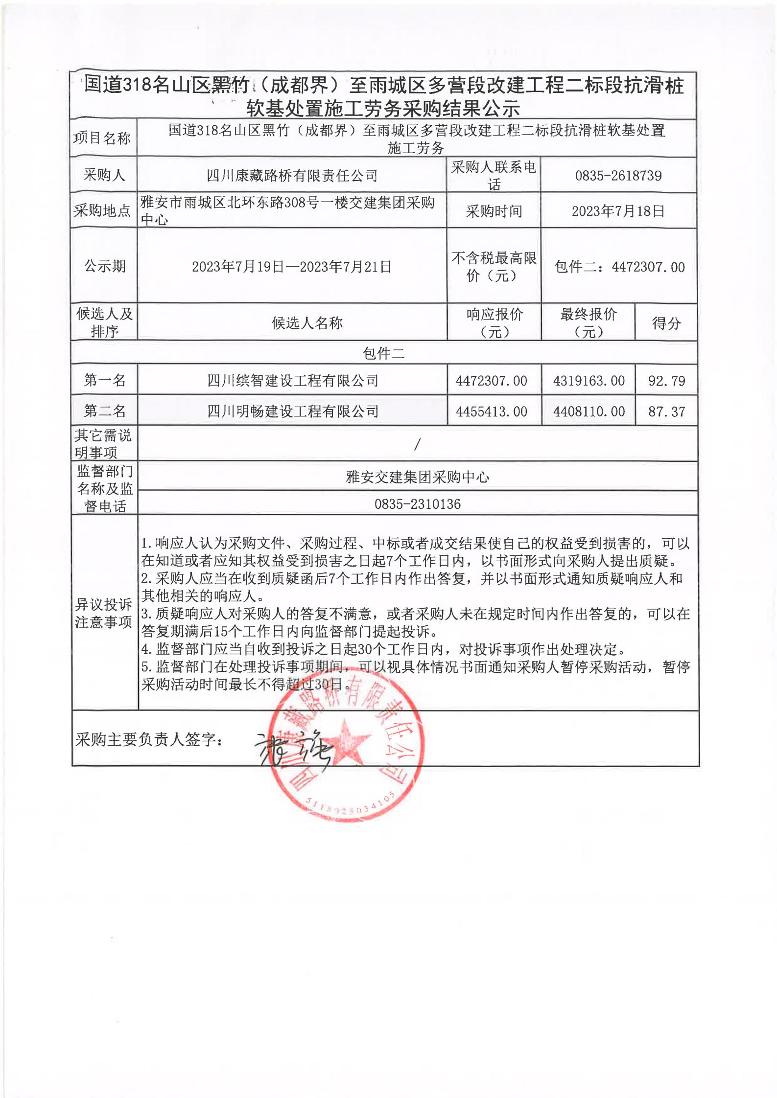 四川康藏路橋有限責任公司國道318名山區(qū)黑竹(成都界)至雨城區(qū)多營段改建工程二標段抗滑樁軟基處置施工勞務(wù)采購結(jié)果公示
