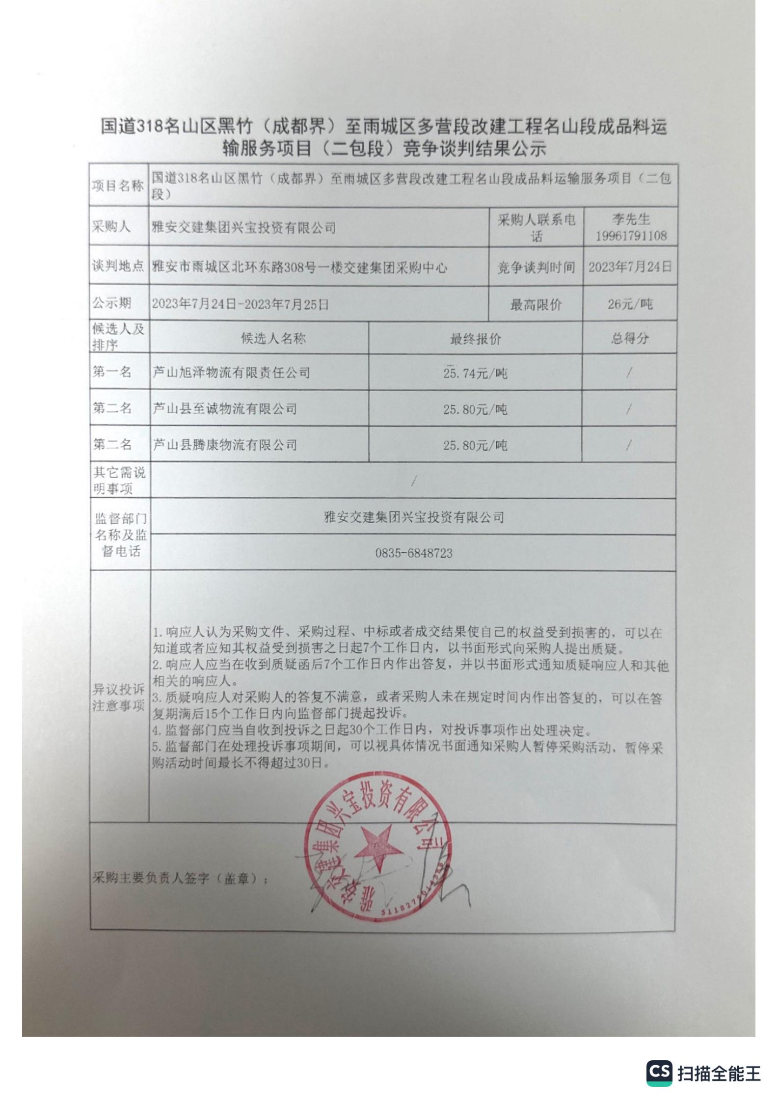 雅安交建集團(tuán)興寶投資有限公司國道318名山區(qū)黑竹(成都界)至雨城區(qū)多營段改建工程名山段成品料運(yùn)輸服務(wù)項(xiàng)目(二包段)競爭談判結(jié)果公示