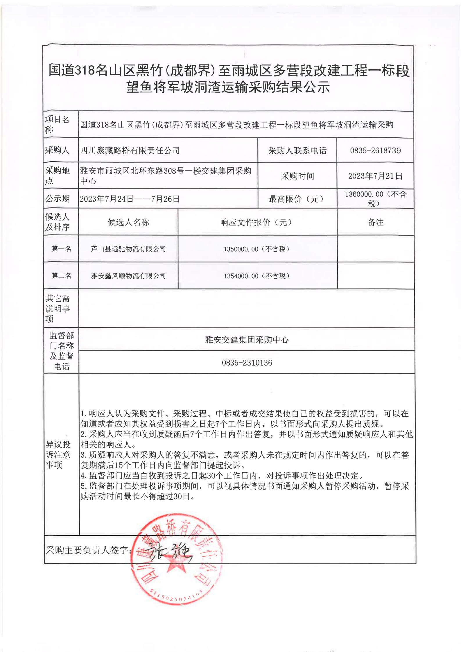 四川康藏路橋有限責(zé)任公司國(guó)道318名山區(qū)黑竹(成都界)至雨城區(qū)多營(yíng)段改建工程一標(biāo)段望魚(yú)將軍坡洞渣運(yùn)輸采購(gòu)結(jié)果公示