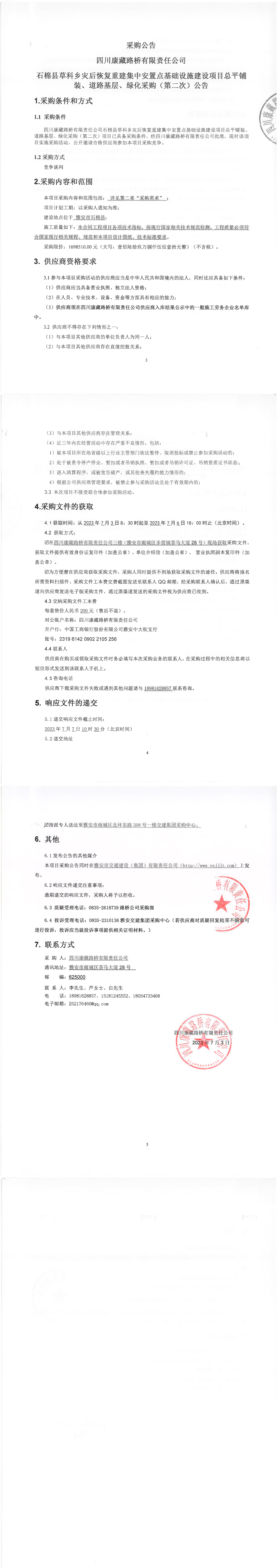 四川康藏路橋有限責(zé)任公司石棉縣草科鄉(xiāng)災(zāi)后恢復(fù)重建集中安置點(diǎn)基礎(chǔ)設(shè)施建設(shè)項(xiàng)目總平鋪裝、道路基層、綠化采購(第二次)公告