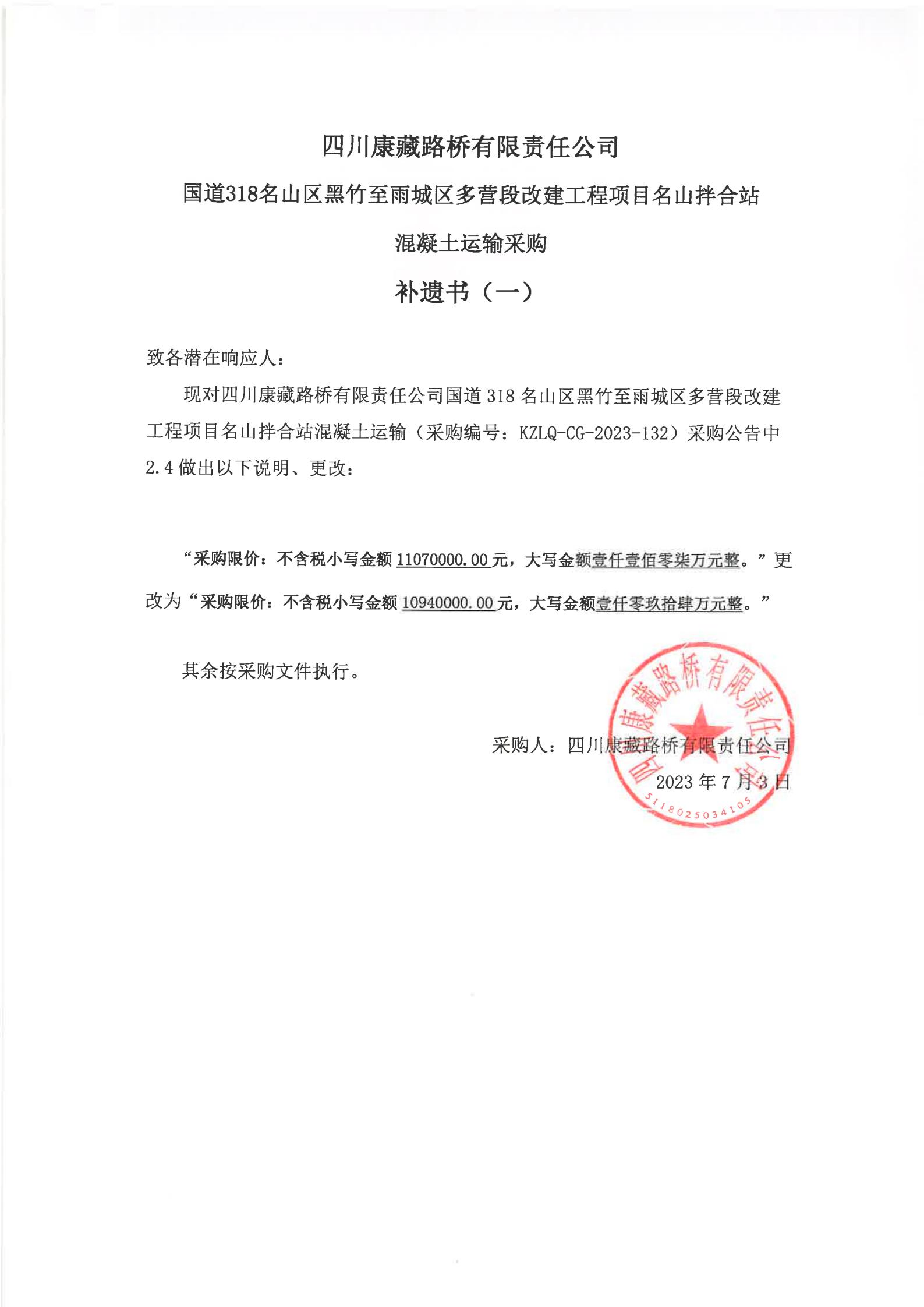 四川康藏路橋有限責(zé)任公司國道318名山區(qū)黑竹至雨城區(qū)多營段改建工程項目名山拌合站混凝土運輸服務(wù)采購補遺書