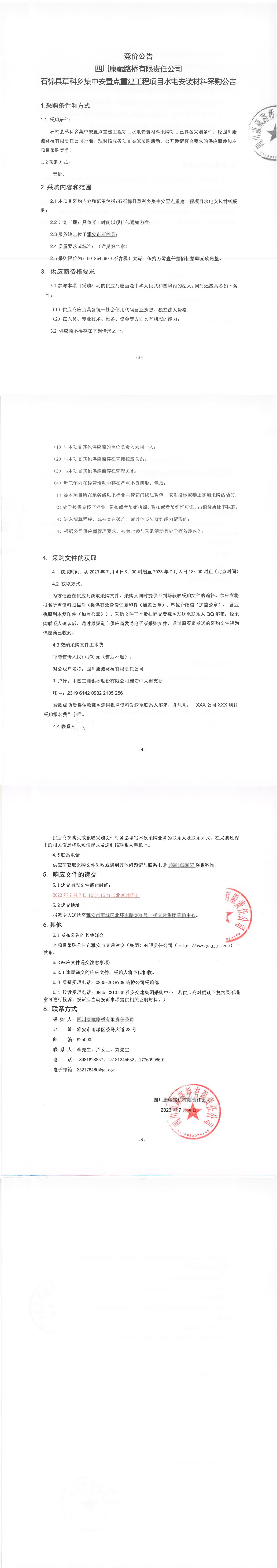 四川康藏路橋有限責任公司石棉縣草科鄉(xiāng)集中安置點重建工程項目水電安裝材料采購公告
