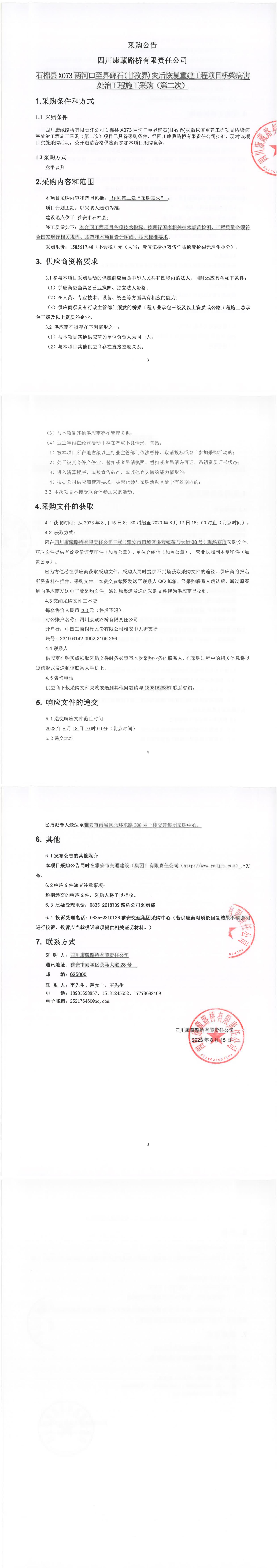 四川康藏路橋有限責任公司石棉縣X703兩河口至界碑石(甘孜界)災后恢復重建工程項目橋梁病害處治工程施工采購(第二次)