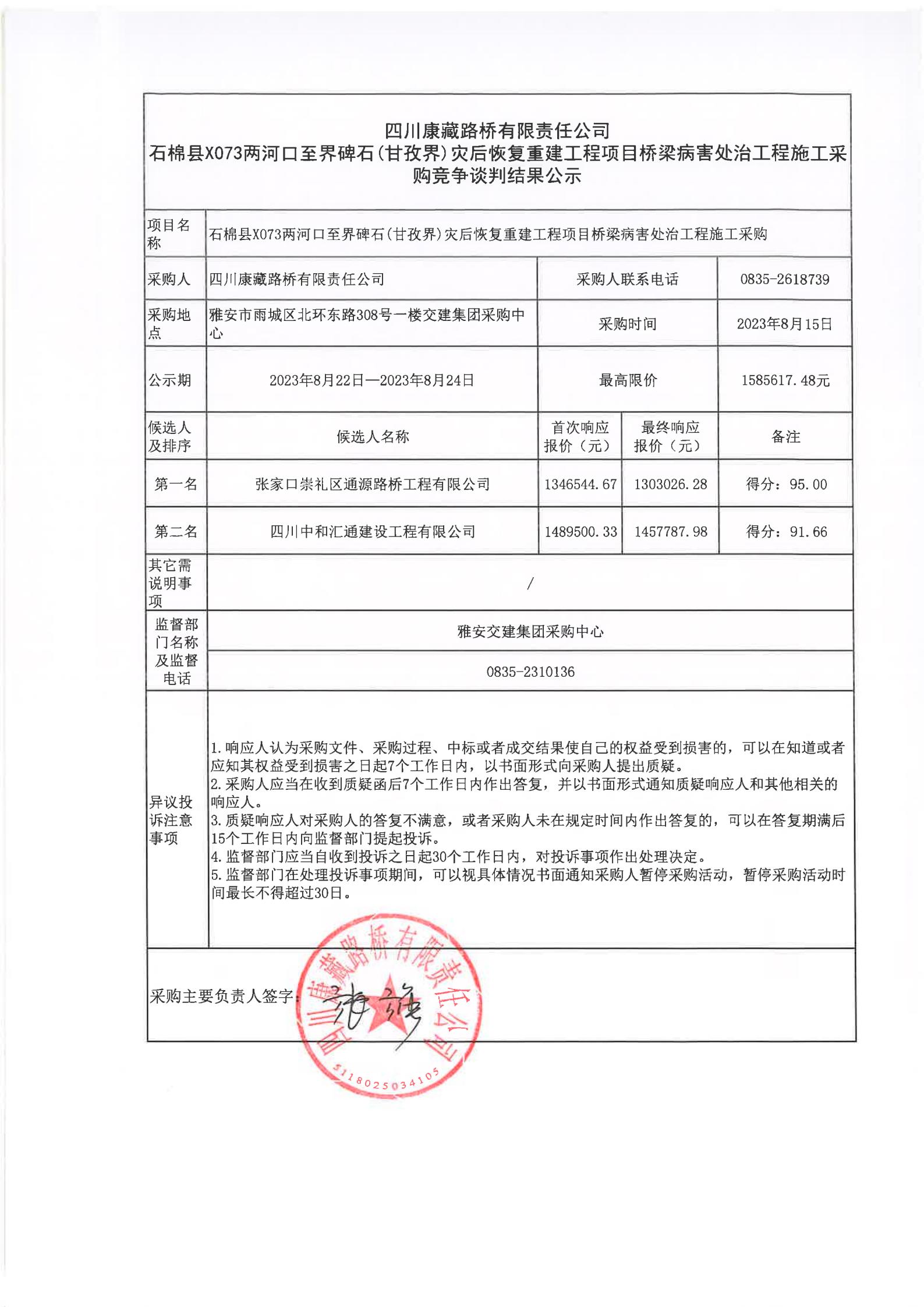 四川康藏路橋有限責任公司石棉縣X073兩河口至界碑石(甘孜界)災后恢復重建工程項目橋梁病害處治工程施工采購競爭談判結果公示