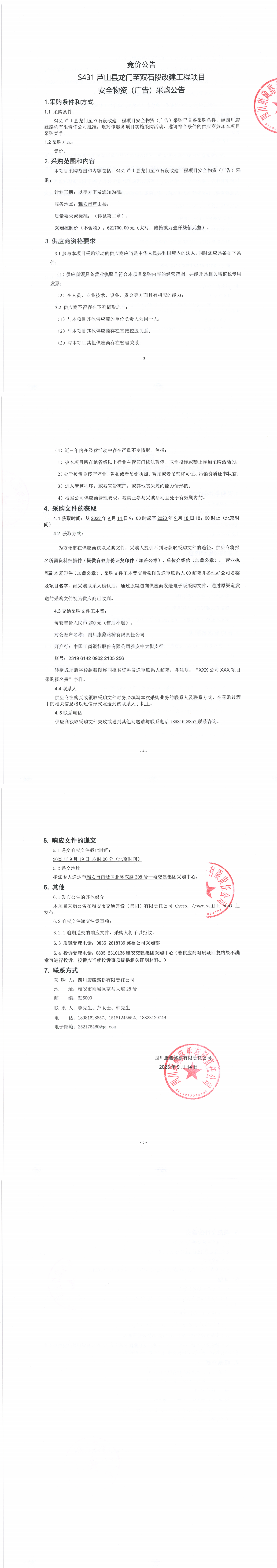 四川康藏路橋有限責(zé)任公司S431蘆山縣龍門至雙石段改建工程項(xiàng)目安全物資(廣告)采購公告