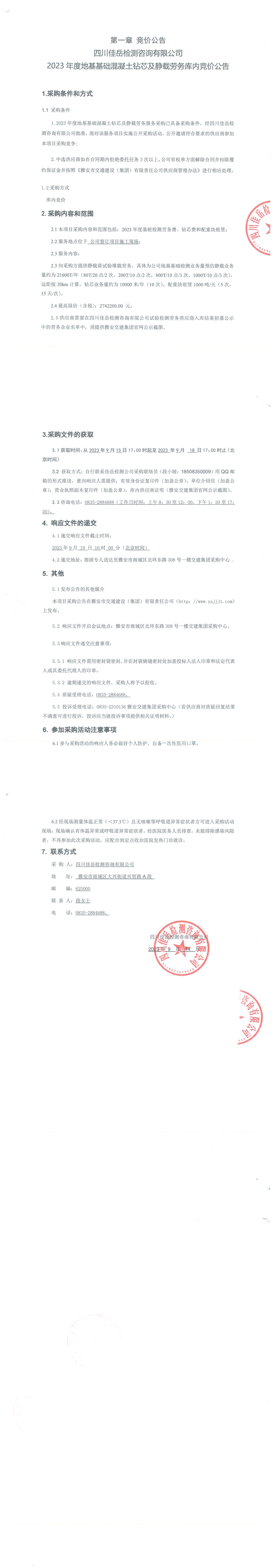 四川佳岳檢測(cè)咨詢有限公司2023年度地基基礎(chǔ)混凝土鉆芯及靜載勞務(wù)庫(kù)內(nèi)競(jìng)價(jià)公告