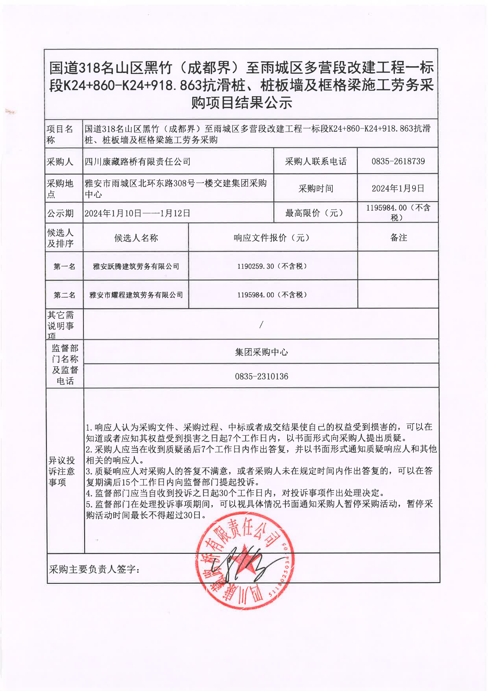 四川康藏路橋有限責(zé)任公司國(guó)道318名山區(qū)黑竹(成都界)至雨城區(qū)多營(yíng)段改建工程一標(biāo)段K24+860-K24+918.863抗滑樁、樁板墻及框格梁施工勞務(wù)采購(gòu)項(xiàng)目結(jié)果公示