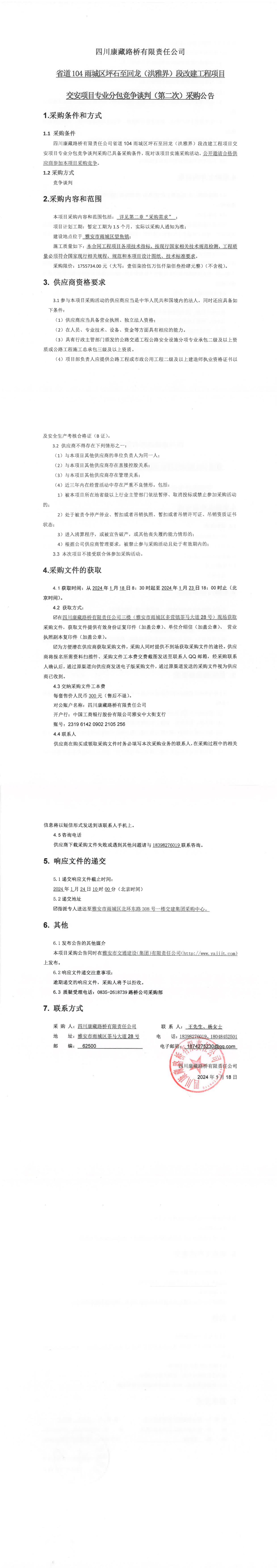 四川康藏路橋有限責(zé)任公司省道104雨城區(qū)坪石至回龍(洪雅界)段改建工程項目交安項目專業(yè)分包競爭談判(第二次)采購公告