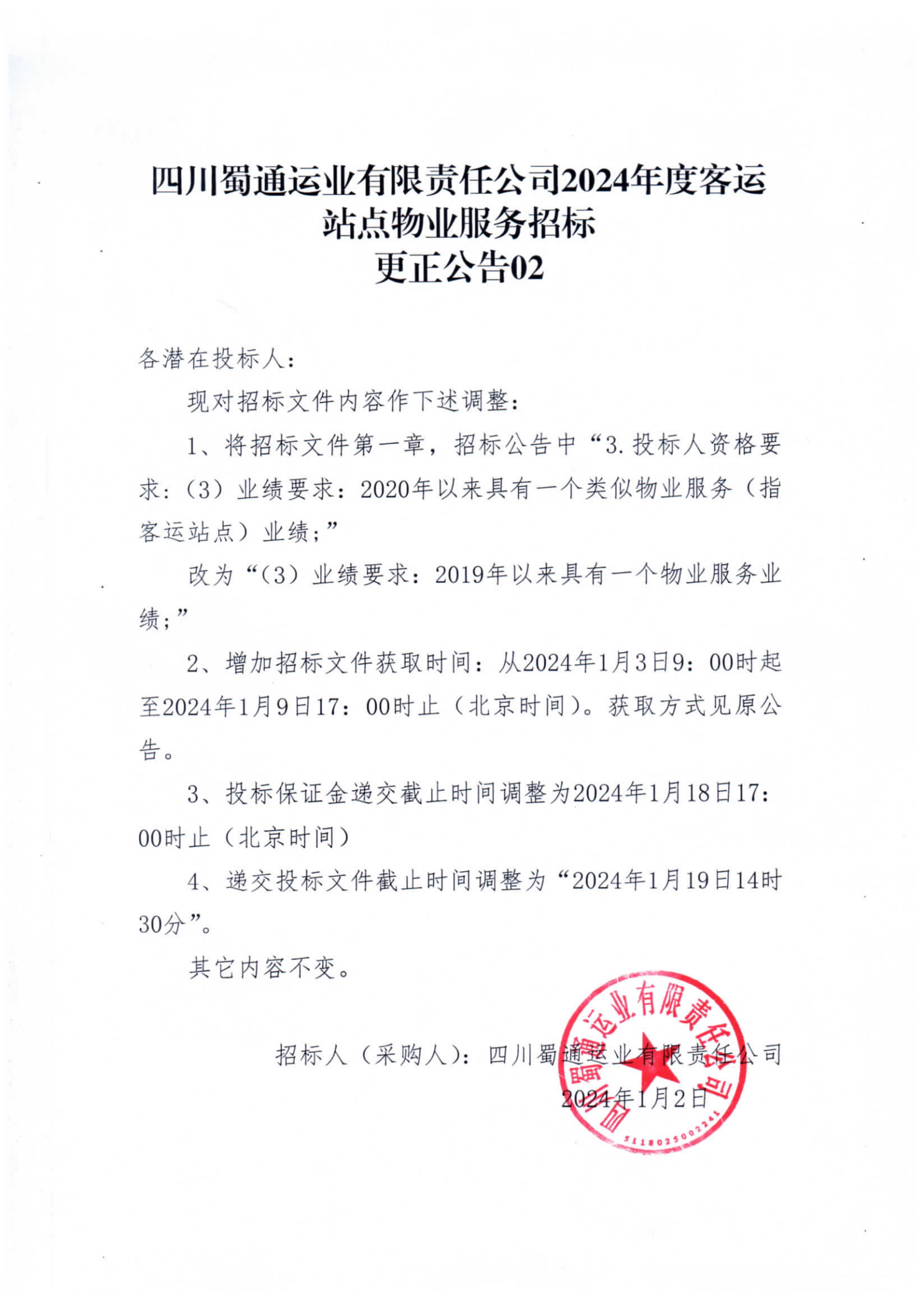 四川蜀通運(yùn)業(yè)有限責(zé)任公司2024年度客運(yùn)站點(diǎn)物業(yè)服務(wù)招標(biāo)更正公告02