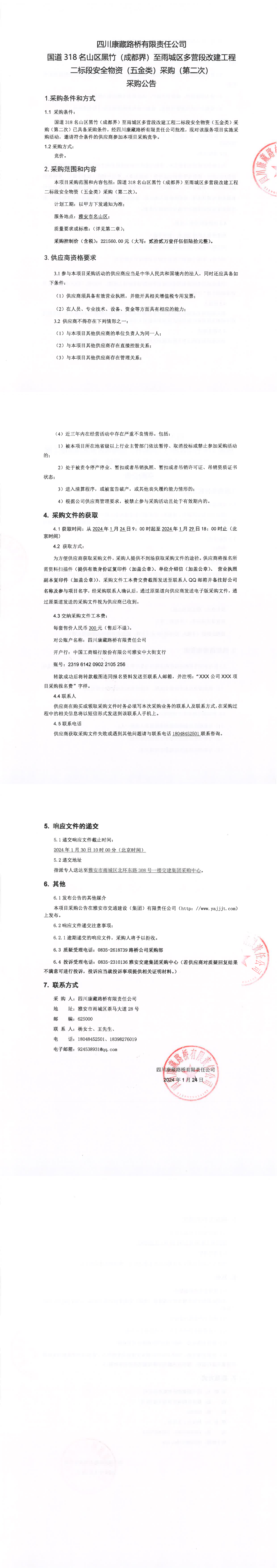 四川康藏路橋有限責(zé)任公司國(guó)道318名山區(qū)黑竹(成都界)至雨城區(qū)多營(yíng)段改建工程二標(biāo)段安全物資(五金類(lèi))采購(gòu)(第二次)采購(gòu)公告