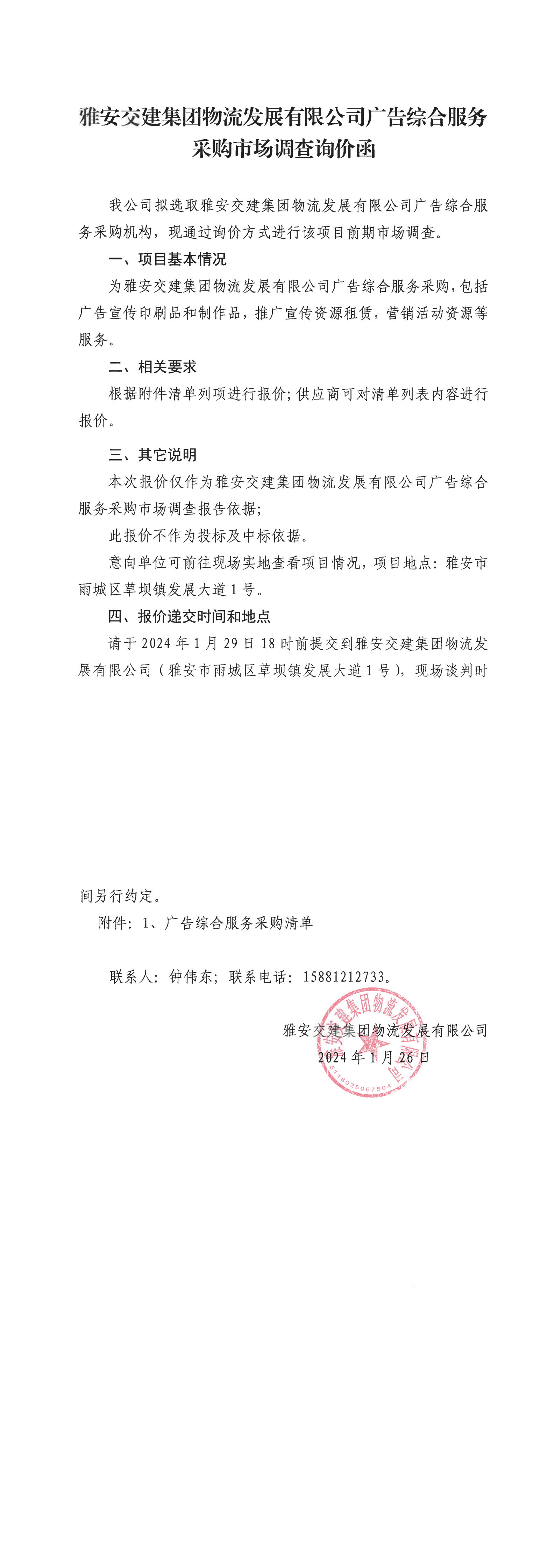 雅安交建集團(tuán)物流發(fā)展有限公司廣告綜合服務(wù)采購(gòu)市場(chǎng)調(diào)查詢價(jià)函