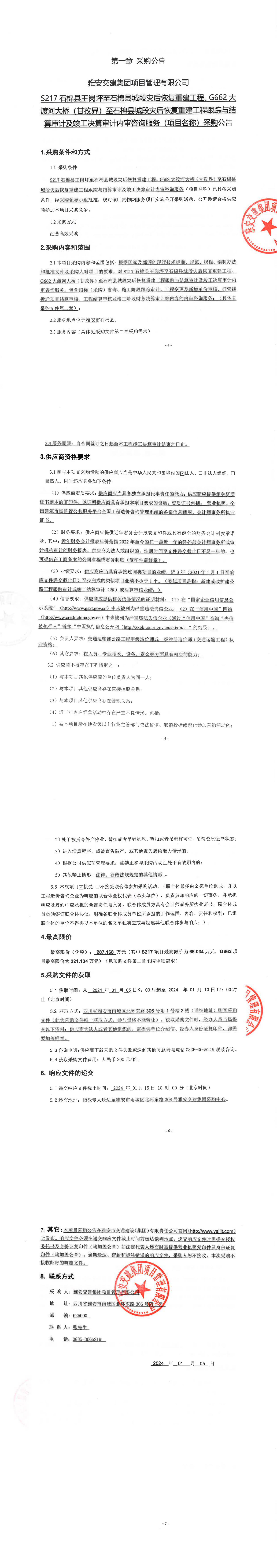 雅安交建集團項目管理有限公司S217石棉縣王崗坪至石棉縣城段災后恢復重建工程、G662大渡河大橋(甘孜界)至石棉縣城段災后恢復重建工程跟蹤與結(jié)算審計及竣工決算審計內(nèi)審咨詢服務(項目名稱)采購公告
