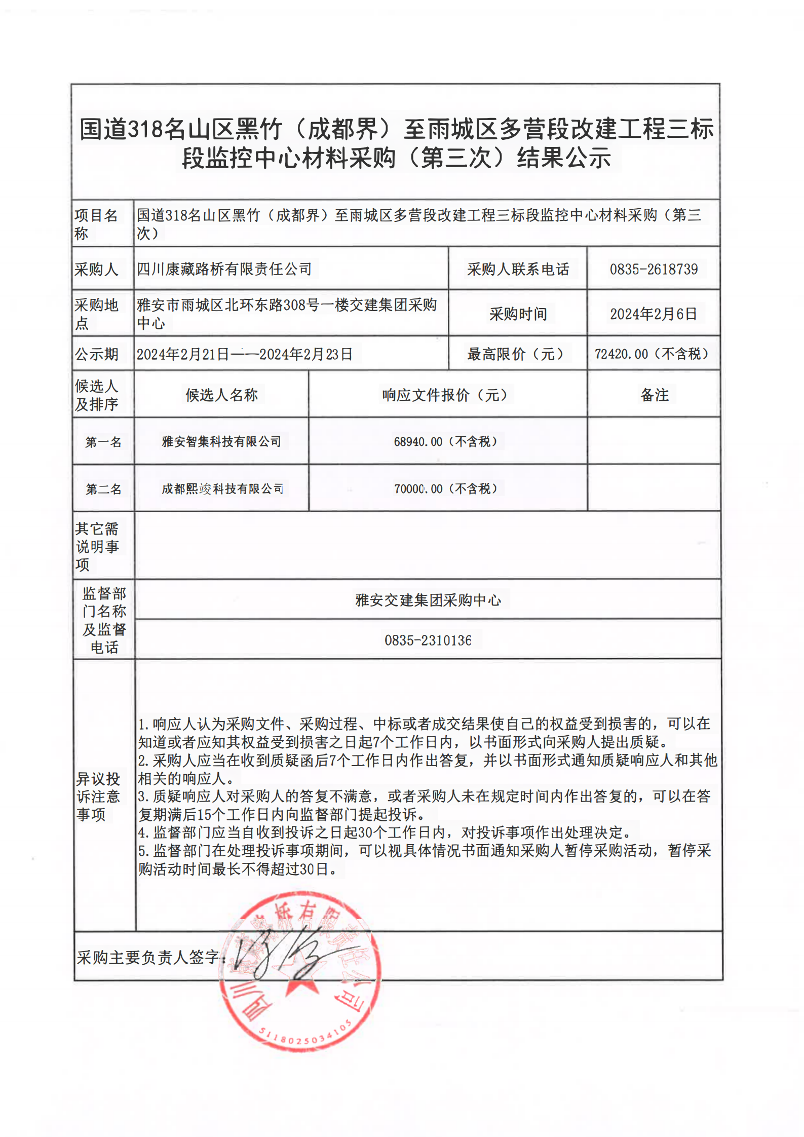 四川康藏路橋有限責任公司國道318名山區(qū)黑竹(成都界)至雨城區(qū)多營段改建工程三標段監(jiān)控中心材料采購(第三次)結果公示