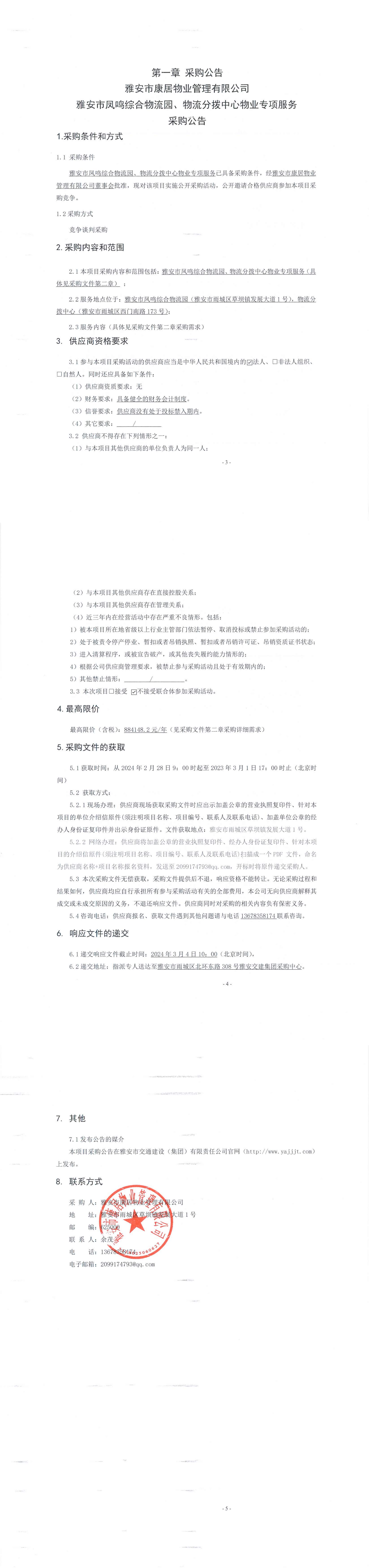 雅安市康居物業(yè)管理有限公司雅安市鳳鳴綜合物流園、物流分撥中心物業(yè)專項服務采購公告