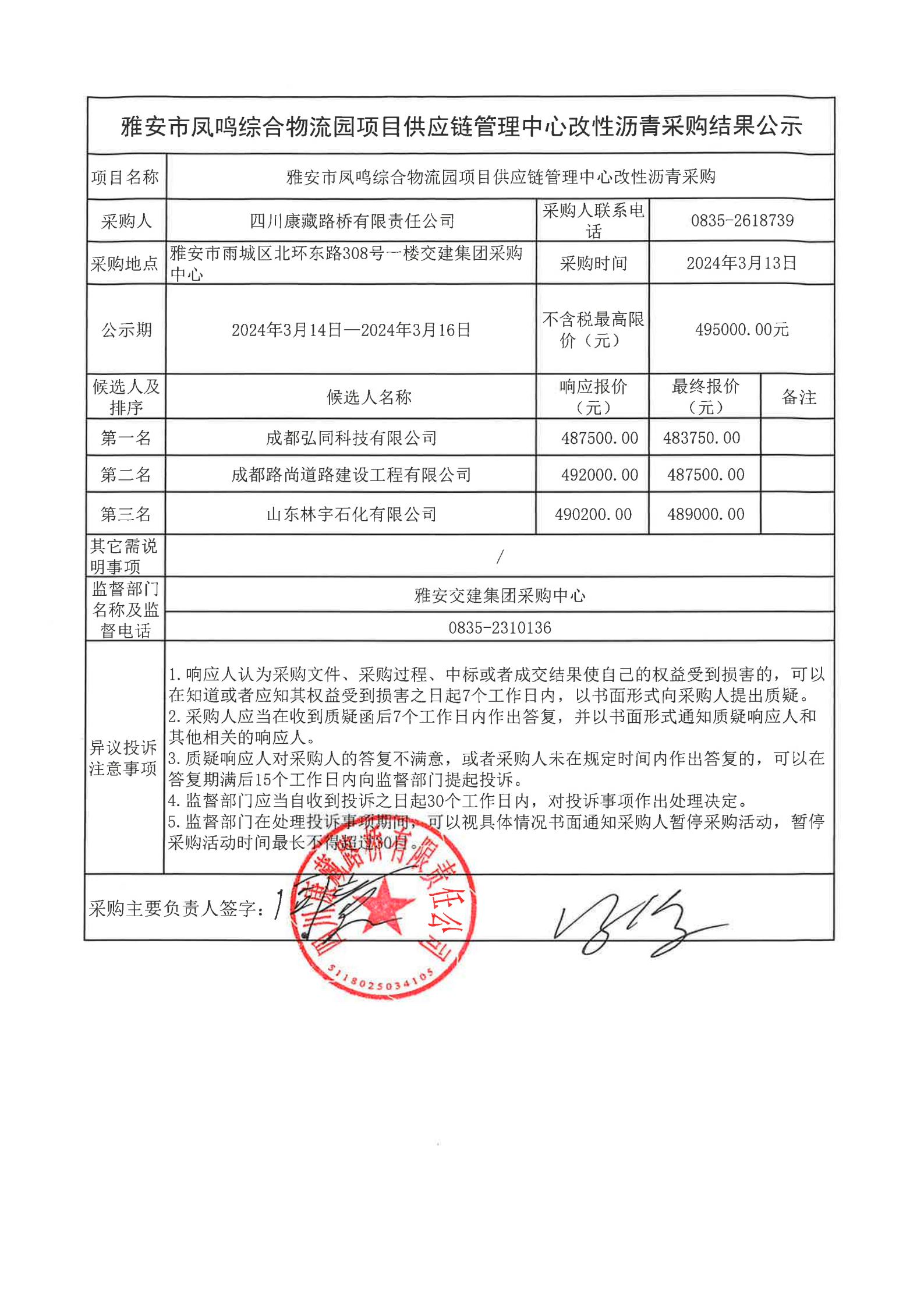 四川康藏路橋有限責任公司雅安市鳳鳴綜合物流園項目供應鏈管理中心改性瀝青采購結果公示