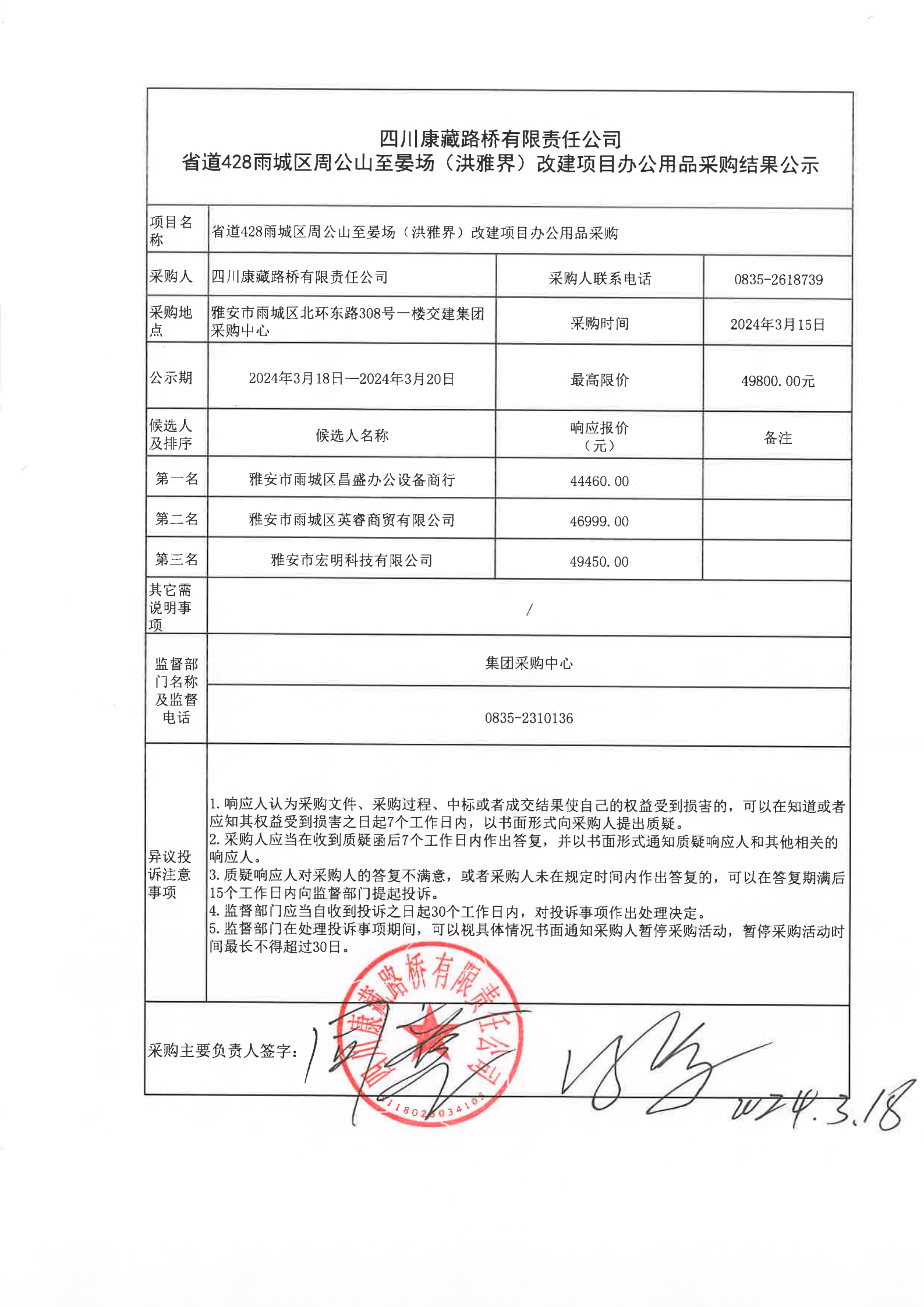 四川康藏路橋有限責(zé)任公司省道428雨城區(qū)周公山至晏場(chǎng)(洪雅界)改建項(xiàng)目辦公用品(第二次)采購結(jié)果公示