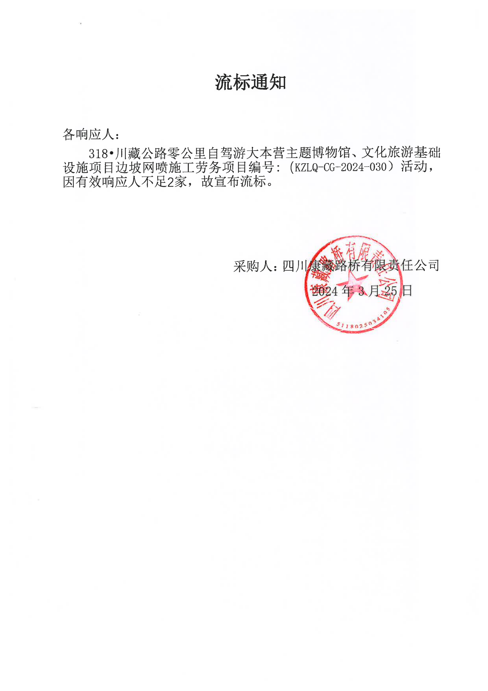 四川康藏路橋有限責任公司318·川藏公路零公里自駕游大本營主題博物館、文化旅游基礎設施項目邊坡網噴施工勞務流標通知