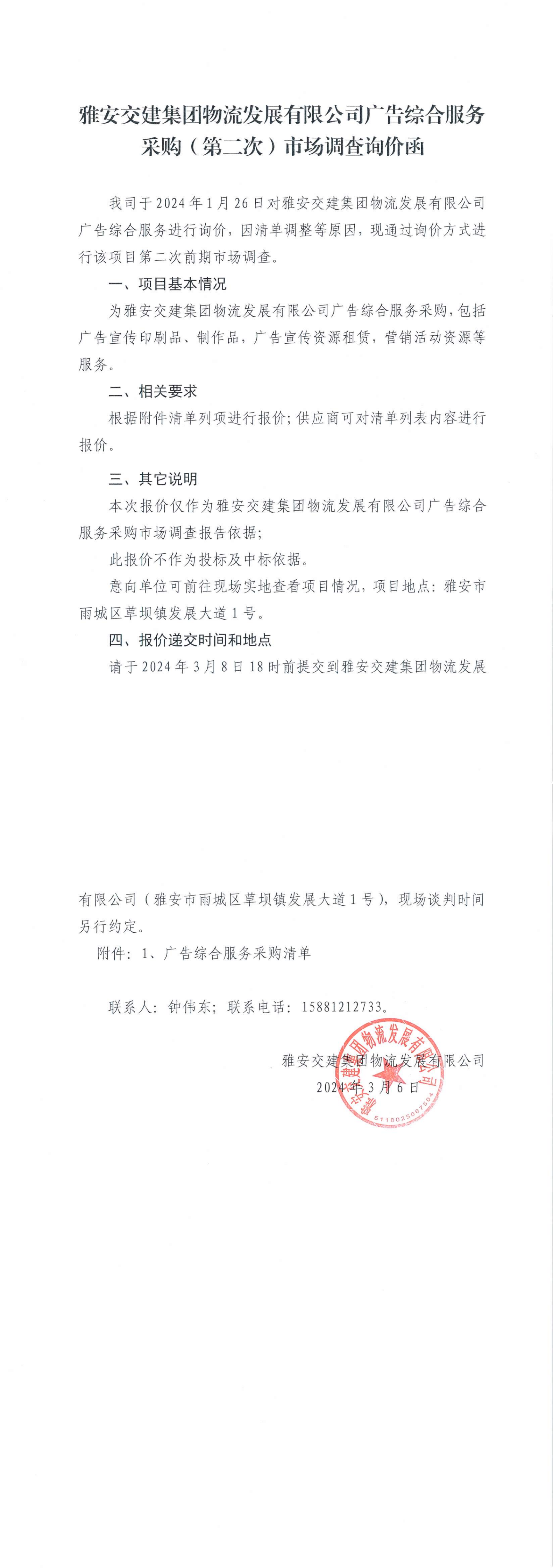雅安交建集團物流發(fā)展有限公司廣告綜合服務采購(第二次)市場調查詢價函