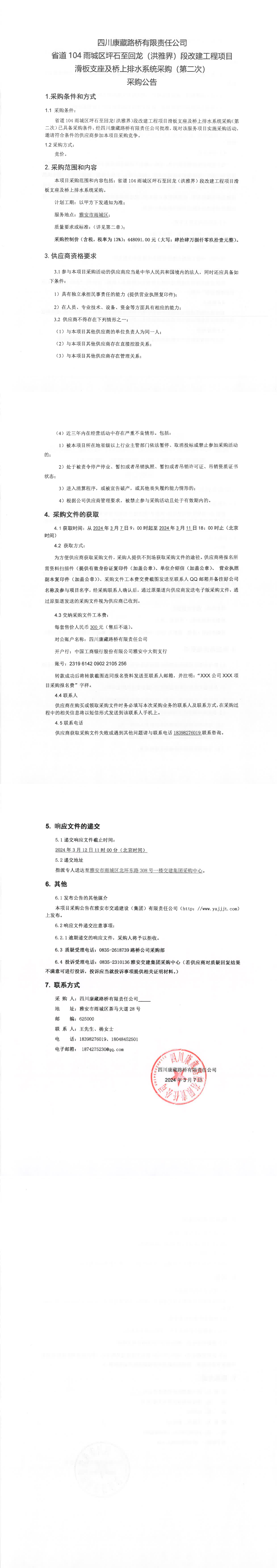 四川康藏路橋有限責(zé)任公司省道104雨城區(qū)坪石至回龍(洪雅界)段改建工程項(xiàng)目滑板支座及橋上排水系統(tǒng)采購(gòu)(第二次)采購(gòu)公告