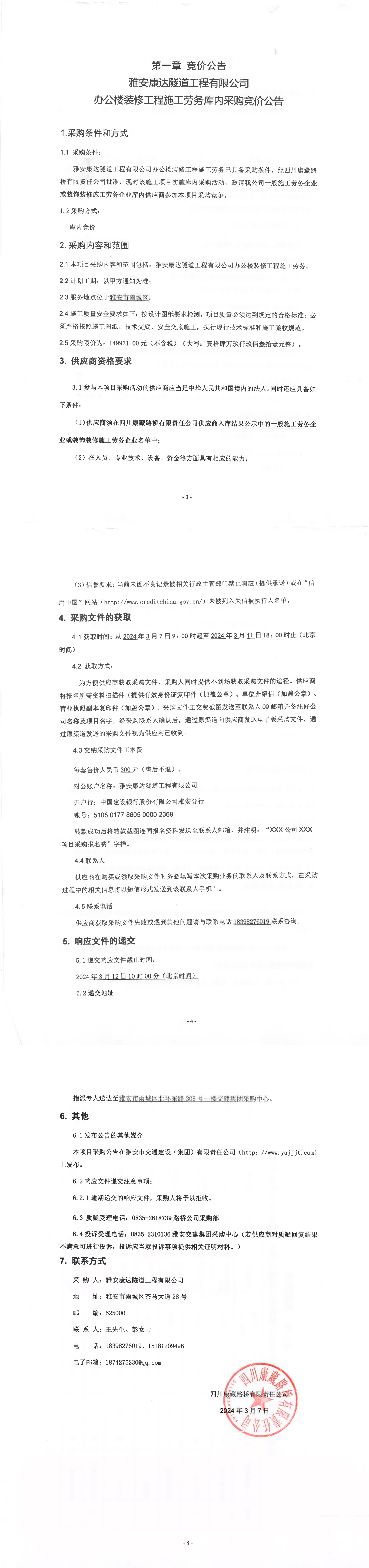 雅安康達(dá)隧道工程有限公司辦公樓裝修工程施工勞務(wù)庫內(nèi)采購競價公告