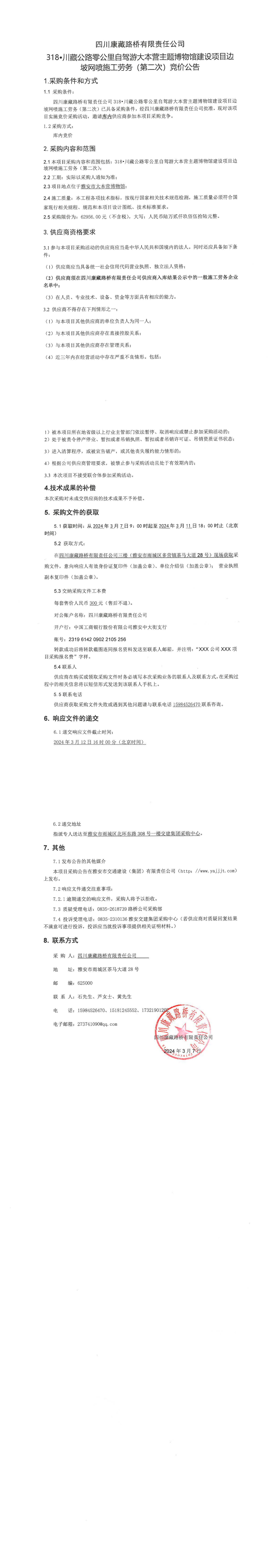 四川康藏路橋有限責(zé)任公司318·川藏公路零公里自駕游大本營(yíng)主題博物館建設(shè)項(xiàng)目邊坡網(wǎng)噴施工勞務(wù)流標(biāo)通知